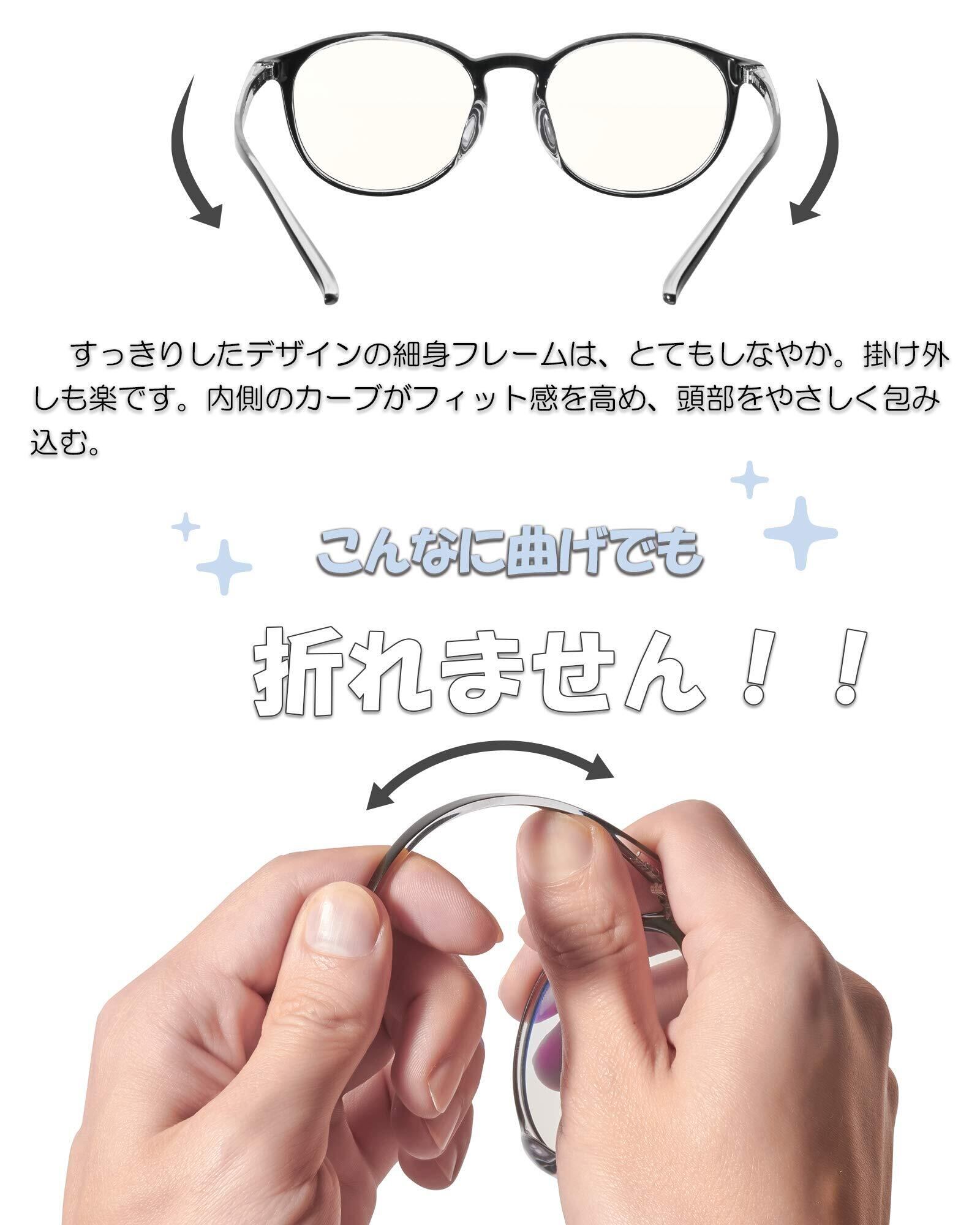 【素材構成】 『フレーム素材』:超軽量弾力「FRENCH PLASTIC G850」 『鼻パッドの形状』:フレーム一体型 『レンズ』:高品質プラスチック/ブルライトカット率40%/UVカット率99%/HEVカット率99%