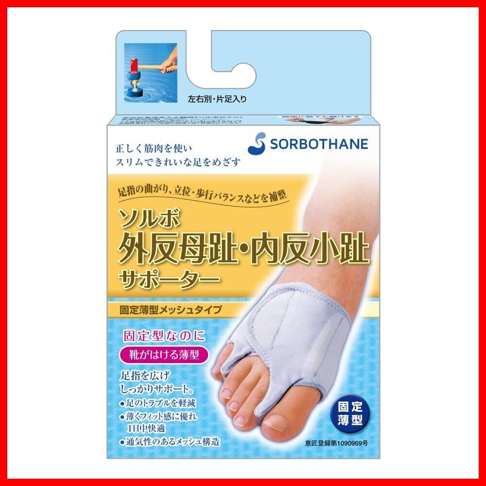 外反や内反による足指のトラブルに。固定力を自由に調整可能です。ソルボセインの優れた圧力分散・衝撃吸収機能により、足指間パッド母趾用と小趾用が、トラブルの軽減と、足指の曲がり、バランスを補整します。固定型なのに靴を履くこともできる、薄く通気性に優れたパワーメッシュ生地を採用し、面ファスナーで、固定力を自由に調整できます。適応サイズは、Sが21.5~23.0cm、Mが23.5~25.0cm、Lが25.5~27.0cmです。