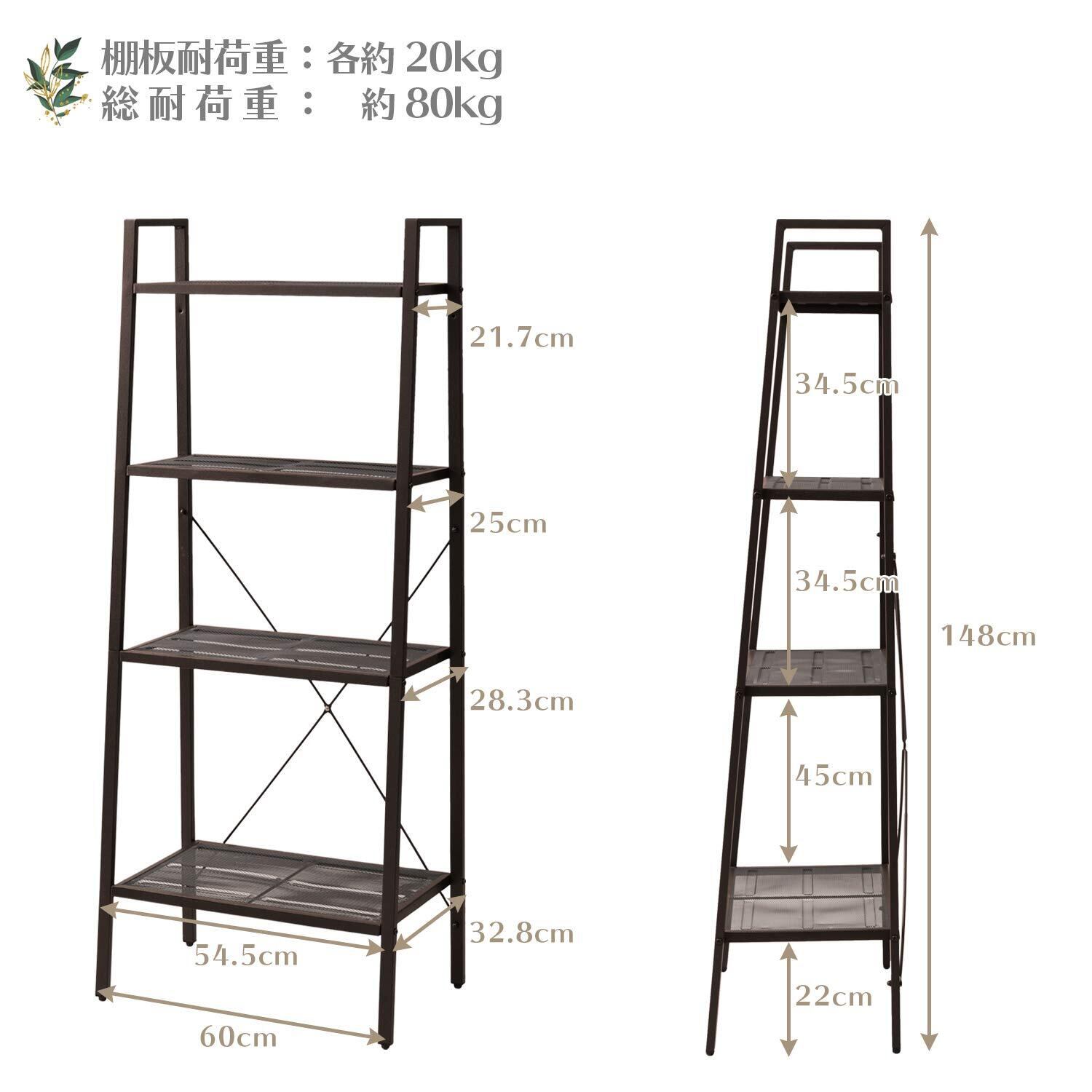 この棚は各棚板約20kg、合計約60kgまでの荷重に耐えます。正しい方法で組み立て、調整し、荷重を超えないようにしてください。