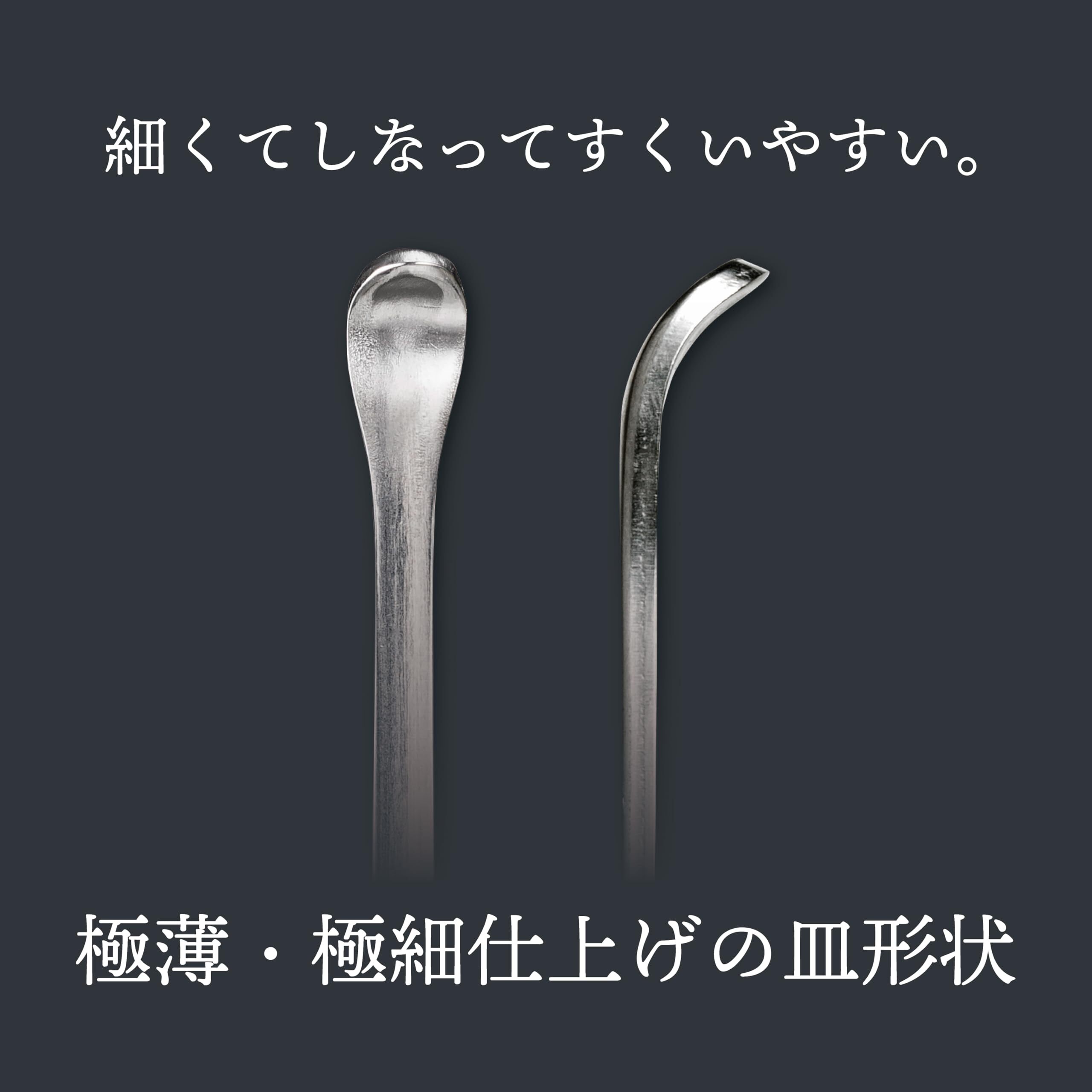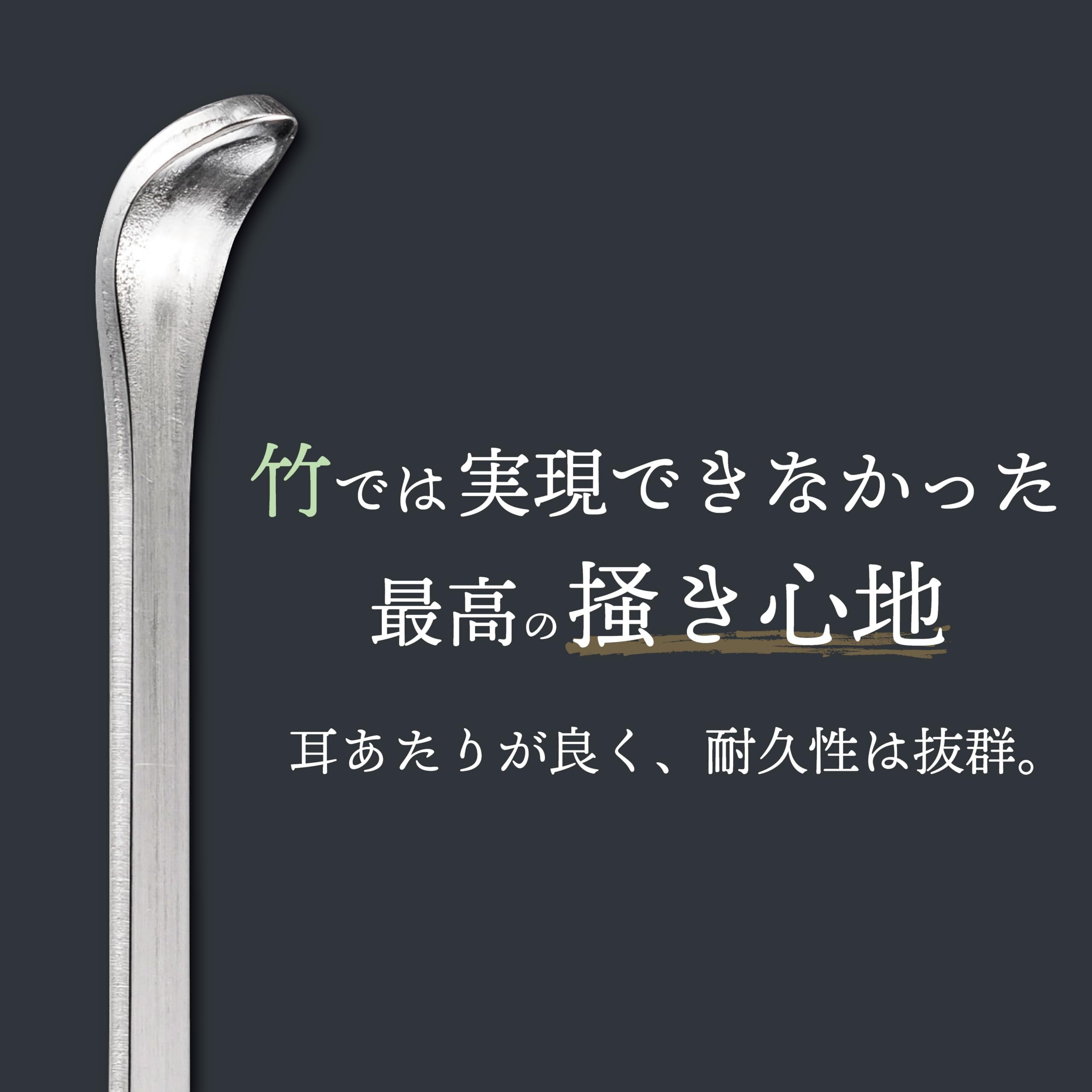 ●耳垢がよく取れる皿形状で心地いい耳かき。●折れない、割れない、サビにくい。●竹では実現できなかった、金属ならではのしなりが実現。