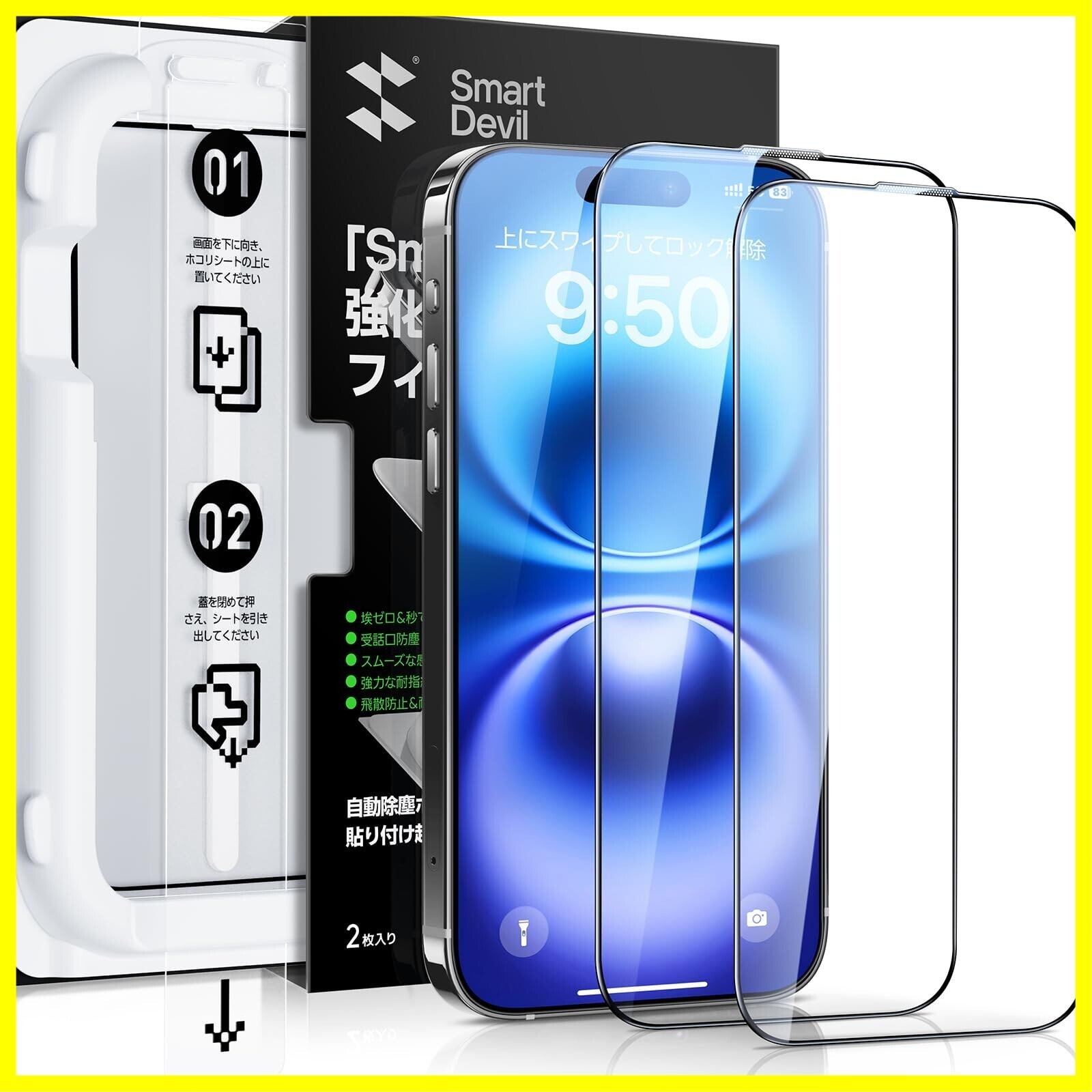 SmartDevil iPhone 16 用 ガラスフィルム 一体式ガイド枠付き 簡単貼り付け HDクリア 位置ずれない 気泡ゼロ 9H硬度 指紋軽減 ラウンドエッジ加工 光沢タイプ ツルツル いphone16 保護フィルム 2枚セット