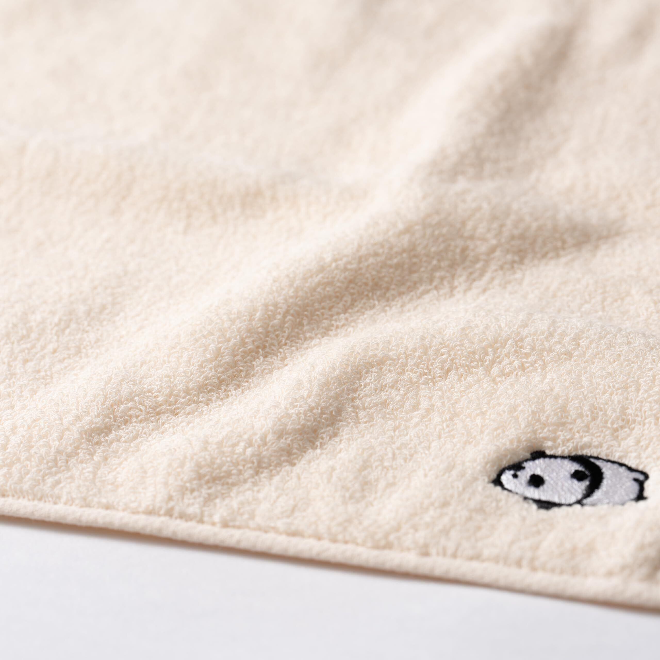 【今治タオル kainoo たまごぱんだ ハンカチタオル】 とってもかわいいぱんだの刺繍がアクセントのハンカチタオルです。たまごいろのふわふわやさしい肌触りが使うたびに癒してくれます。