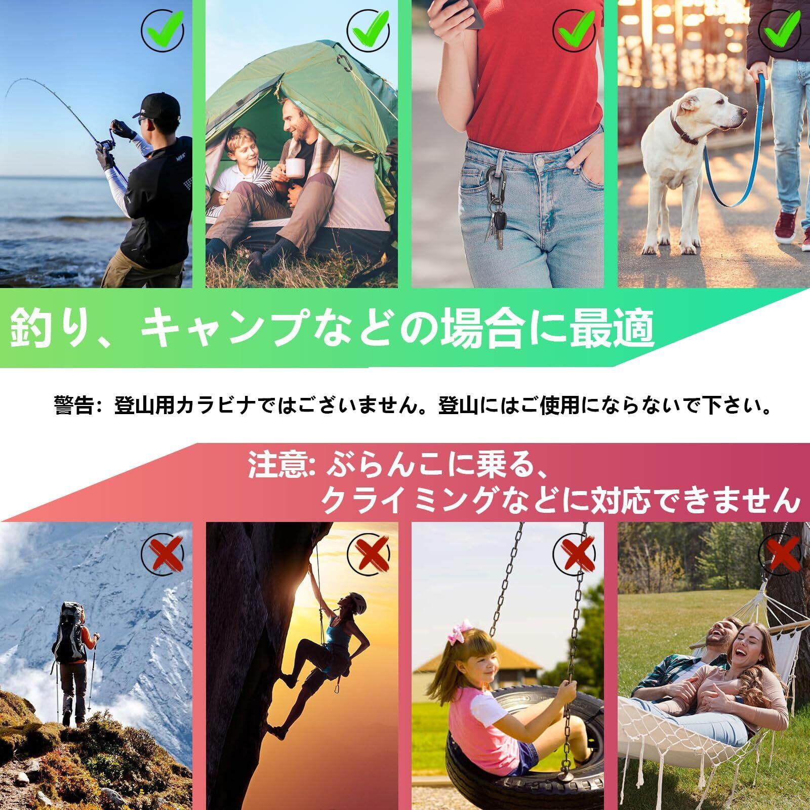 キャンプ カラビナはテントやタープ設営時、簡単に装着でき、強い風でも破損する事無くしっかり使えています。本小型 カラビナは登山、クライミング用途では使用できませんのでご注意ください。