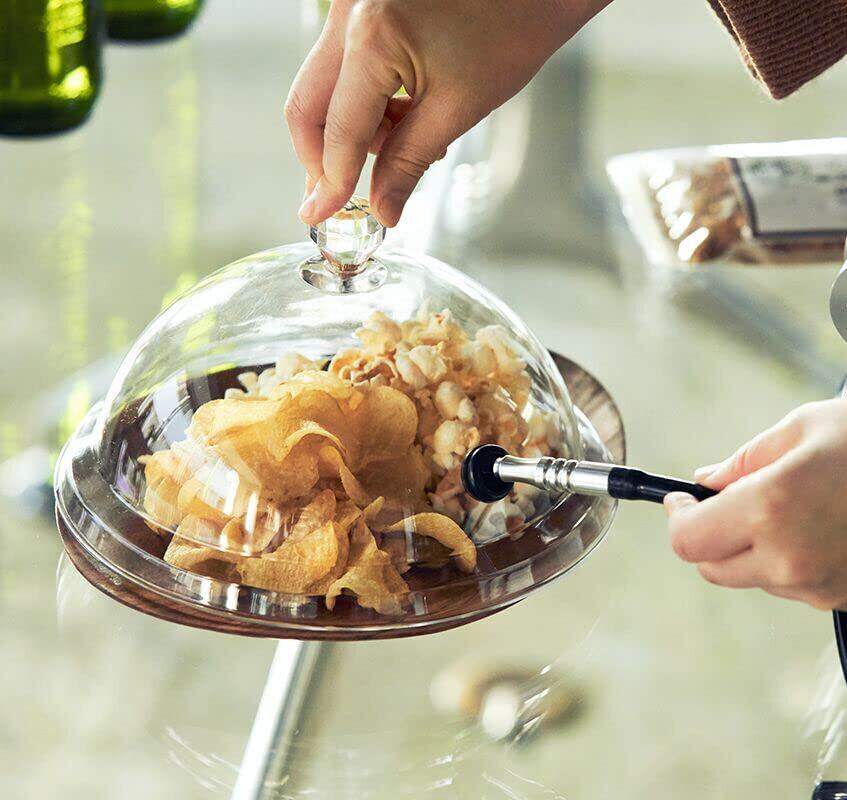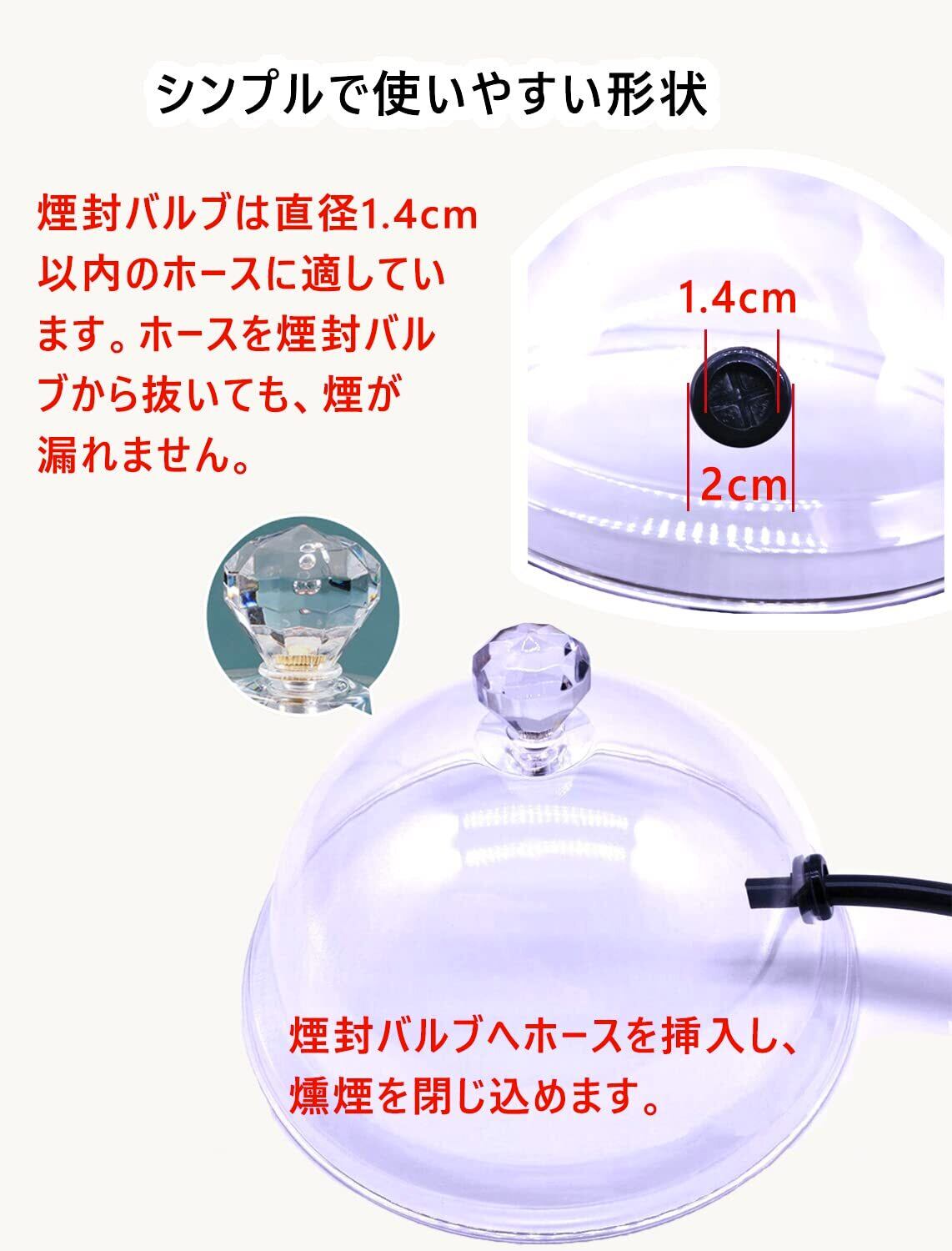 他の同種類の製品の問題点に比べて(燻製機の燻製チューブが差し込めない、バブルの下にひび割れが)、この製品は改良されたので、以上の問題は発生しません。この製品は2年間販売して、何度も改良しまし。本製品は冷薫加工をより便利にします。透明ドームは、素敵な冷薫の雰囲気を醸し出します。パーティー、レストラン、カクテルなど様々な場所に適しています。