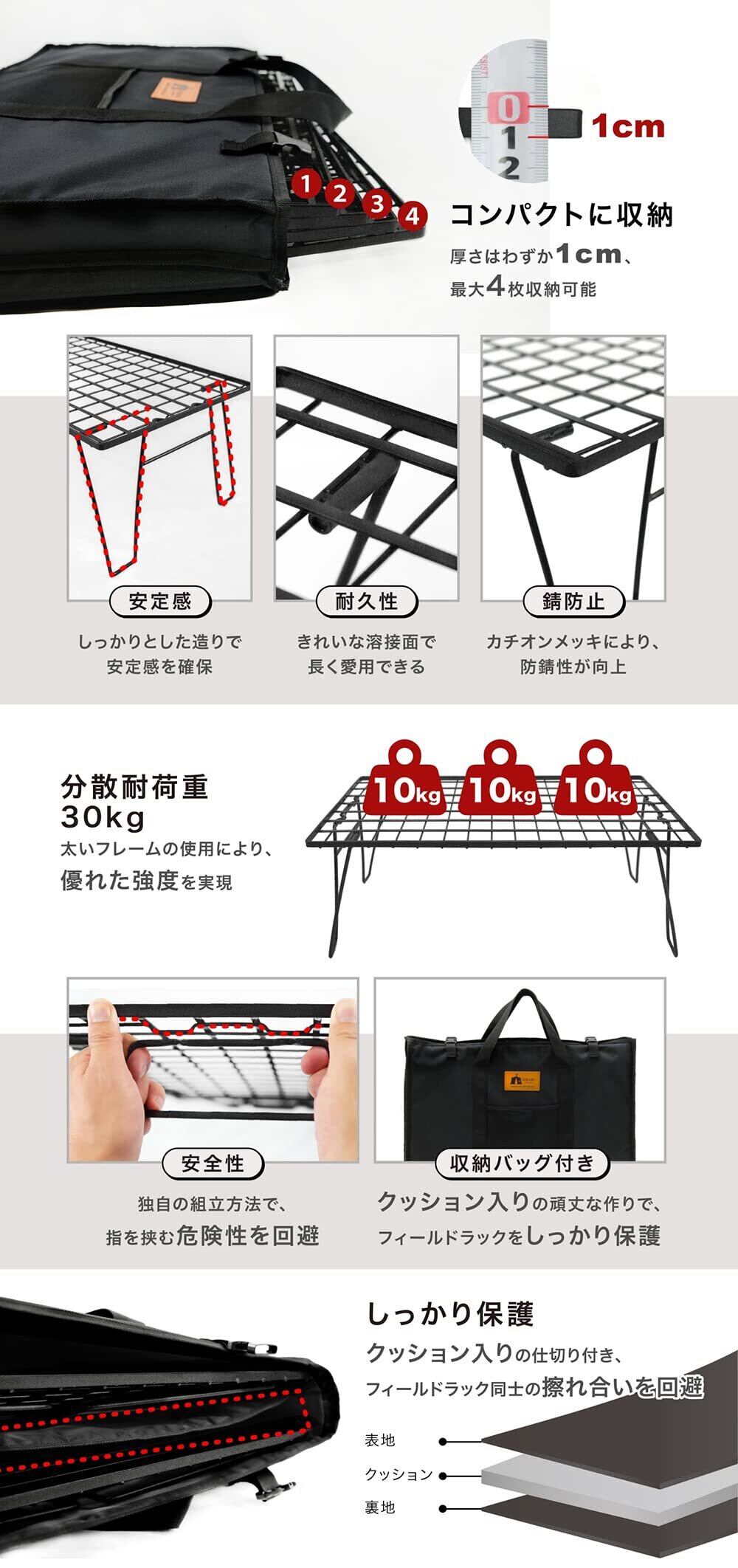HIBARI フィールドラック キャンピングラック アルミ天板セット 収納ケース付き マットブラック キャンプ収納 コンパクト アウトドアワゴン アウトドアテーブル 折りたたみ テーブル ローチェアアウトドア キャンプテーブル おしゃれ 軽量 (ラック2枚+天板1枚セット)
