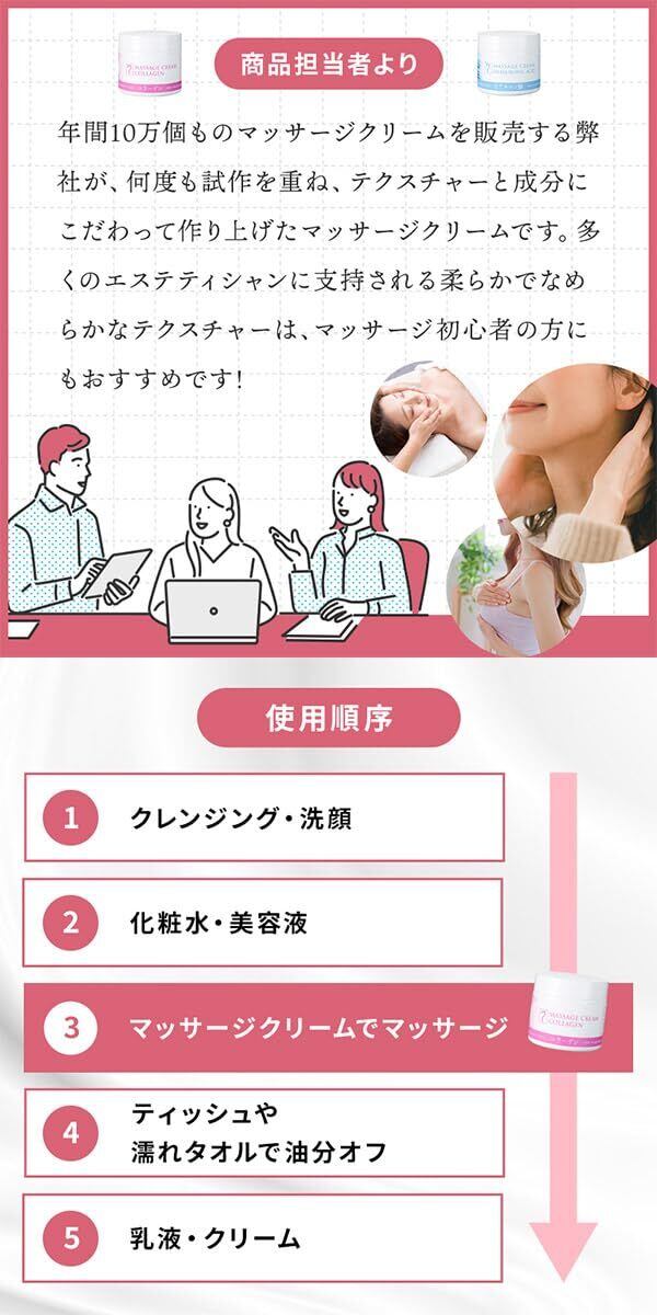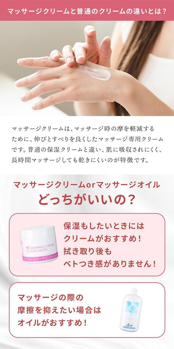 【商品説明】フェイス&ボディに使用できるセブンビューティーオリジナルのマッサージクリームです。年間約10万個※のマッサージクリームを販売するセブンビューティーが、テクスチャーと美肌へ導く成分にこだわったマッサージクリームを開発いたしました。コラーゲンタイプは、お肌にハリと潤いを与える加水分解コラーゲン配合で、みずみずしくふっくらとした素肌に整えます。[こだわりのテクスチャー]フェイスでもボディでも使いやすいようにこだわった柔らかくなめらかなテクスチャーを実現。少量でも伸びが良いので、施術中に継ぎ足すことなくスムーズにマッサージが行え、コスパも抜群です。[こだわりの成分]まるで美容クリームのような美容成分を多数配合。マッサージと同時に美容成分をお肌に届けることで、すっきり美肌へ仕上げます。(※集計期間:2020年1月~12月、対象:SEVEN BEAUTYで取り扱いのすべてのマッサージクリームの累計)