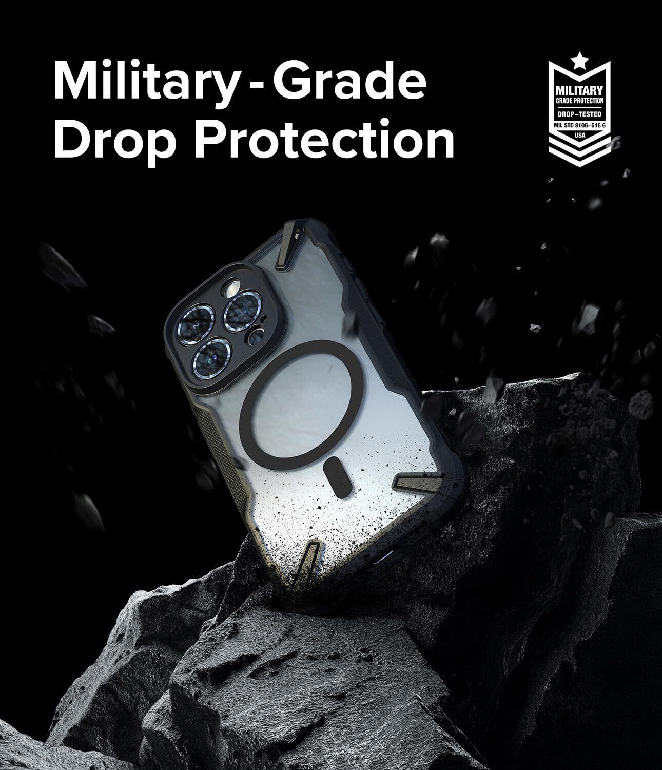 【Ringke Fusion-X Magnetic】特殊加工により搭載されたマグネット、そして高弾性フレームと特殊技法が適用されたラギッドなデザインのケースです。