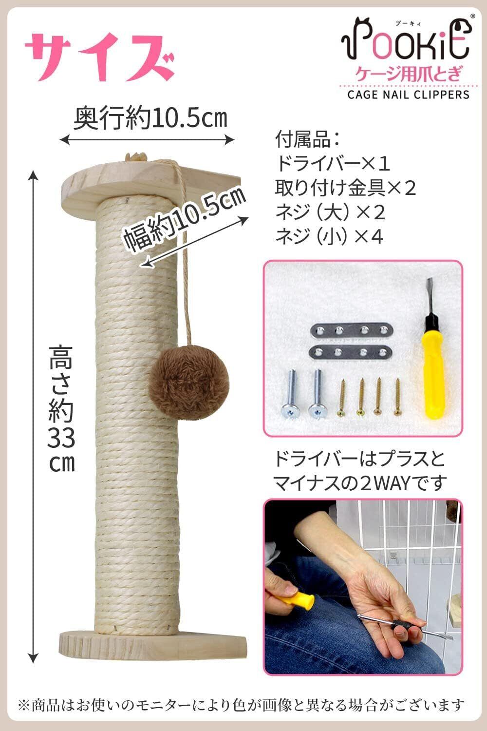 【組み立て&取付】板と麻巻きポールを一体化し、ポンポンを取付け、お手持ちのケージに金具で挟み込むだけ!取付に必要な工具やネジも付属しています。