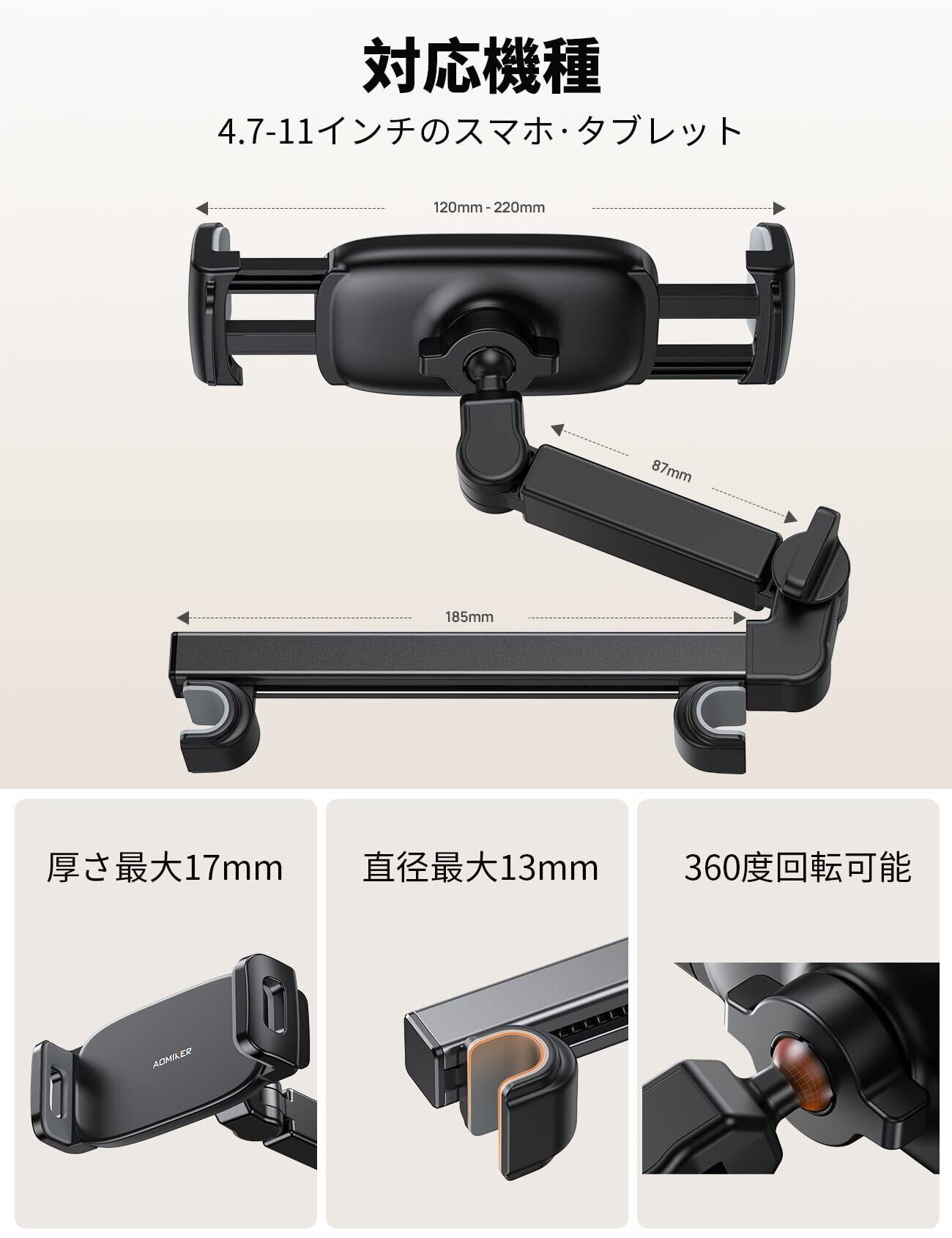 【伸縮アーム】 Aomiker 車 タブレット ホルダー 後部座席 : ヘッドレスト タブレット 車載 ホルダー バーの適用幅範囲72mm-153mm 後付け たぶれっと ほるだー くるま カー用品 ipad 10 第十世代, ipad pro, mini, Air, android, 4.7-11インチのスマホ タブレットに対応 - 黒