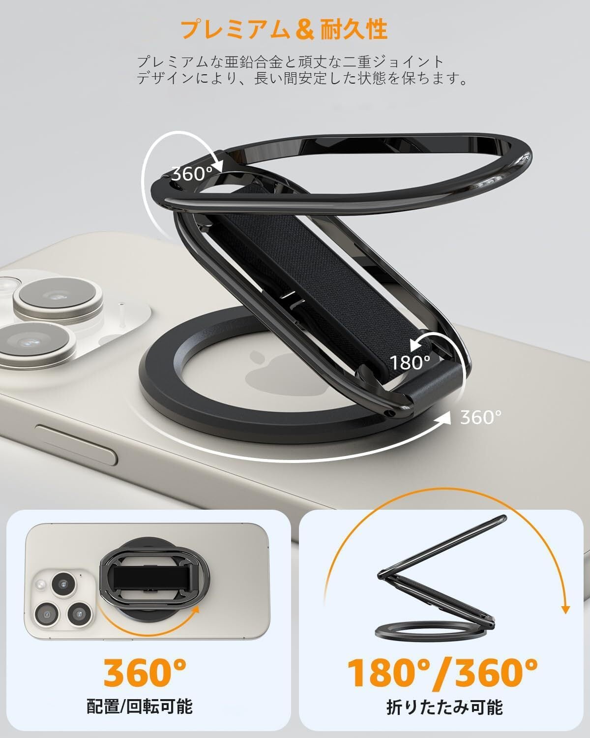 【多角度調整可能なスタンド】このiPhone磁気リングスタンドは、多角度調整可能なスタンドを備えており、360度回転し、ダブルジョイントで280度および360度反転します。35000回の折りたたみテストを経ても緩まないように設計されています。横向きと縦向きの2つのハンズフリーモードを提供します。ビデオ、映画、YouTube、Instagramの視聴、セルフィー撮影、または他の人とFaceTimeで話すためのマグセーフスマートフォンスタンドとして使用できます。