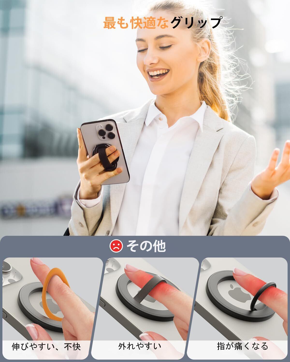 【モアコンフォータブルグリップ】調整可能な柔らかいベルクロストラップが装備されており、指に基づいてベルトの締め付け具合を柔軟に調整することができ、金属リングとは異なり、スマホを持っていても指が不快になりません。