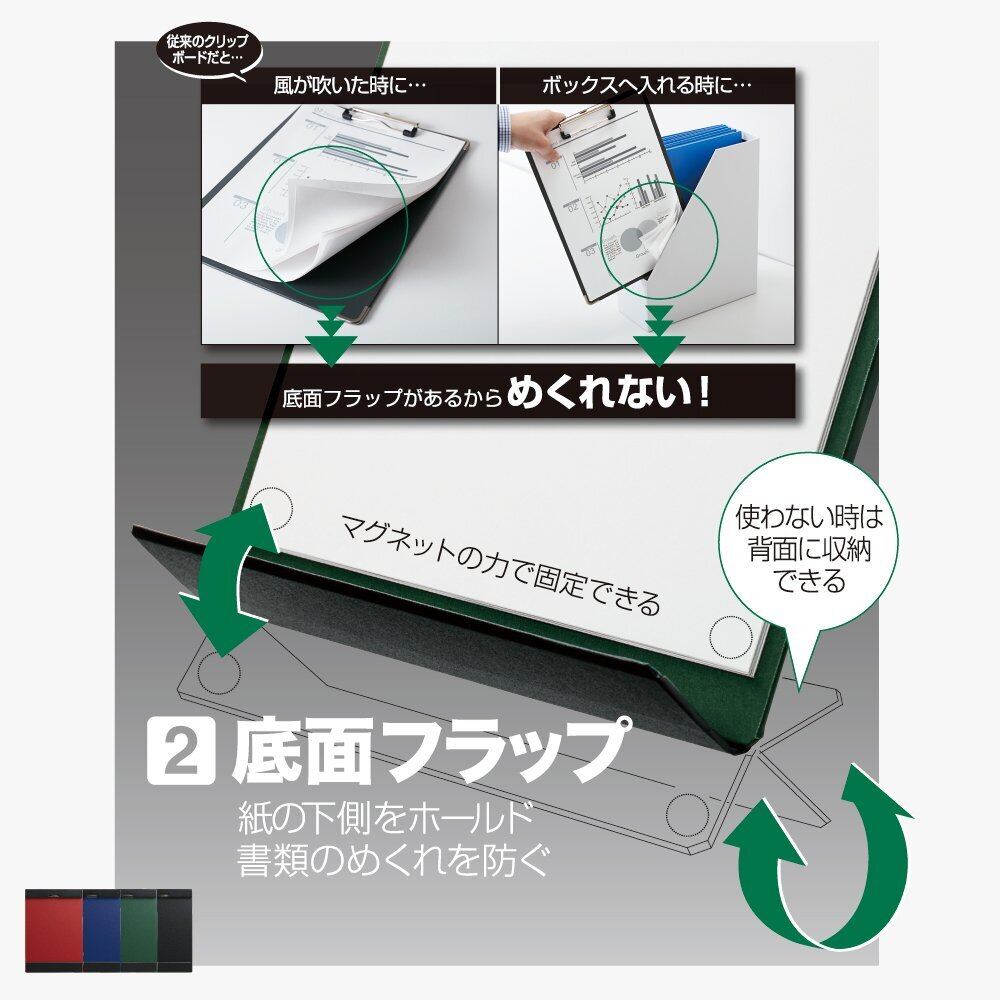 底面フラップが紙の下側をホールド、書類のめくれを防ぐ。