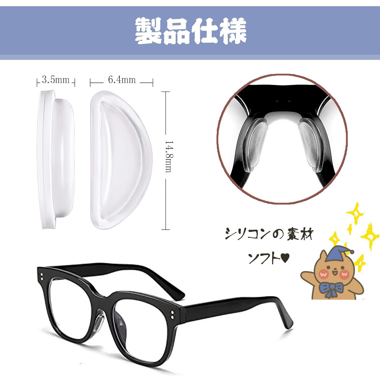 【ずれ落ち防止&メガネ跡軽減】 メガネ鼻パッドは滑り止め加工が皮脂でメガネを滑るのを防ぎます。また、メガネの鼻あてにぴったりフィットし、色素沈着を予防し、鼻に優しく良いつけ心地を体験することができます。 ●この鼻パッドは柔らかい上質なシリコン素材でできており、肌に優しくソフトに当たるので、メガネの痕や化粧くずれを防ぎます。シリコン素材でできているので、長時間の装着でも痛くなく掛け心地が快適です。