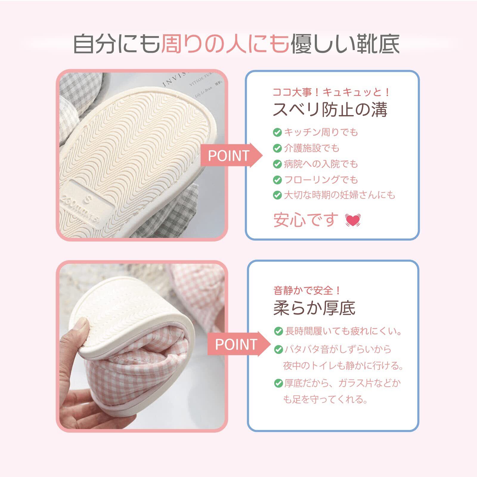 ・ご自宅でのスリッパやお部屋でのルームシューズとしてはもちろん、会社のオフィス用や学校、体育館、病院内などあらゆる場面でお使いいただけます。