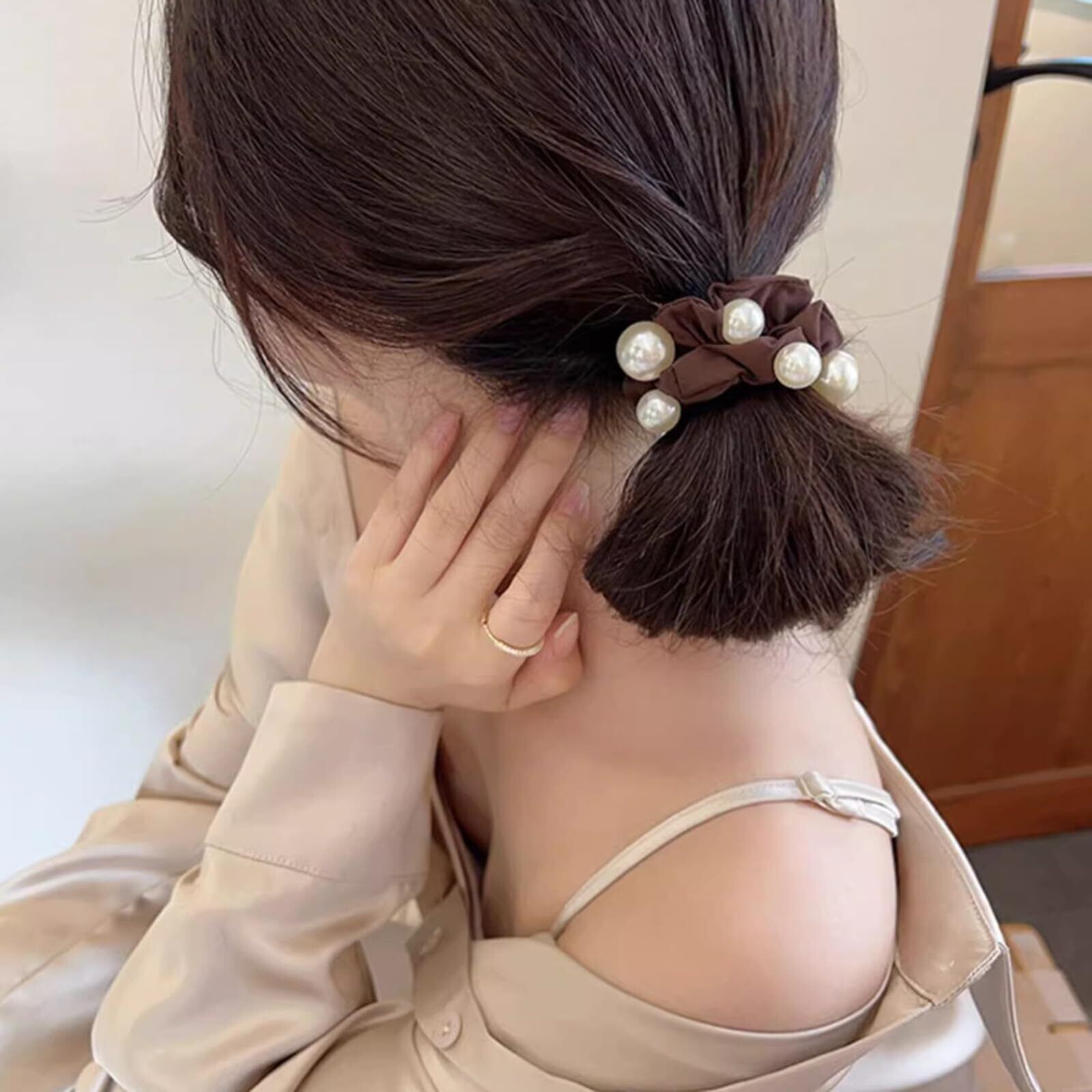 【いろいろなシーンで】ポニーテールやお団子ヘアの仕上げに使うのはもちろん、チャームのようにバッグにつけたり、手首に巻いてブレスレット替わりに使ったりするのもok。シンプルなのに華やかなので仕事や、お出かけ、おうちでのリラックス時に、毎日愛用して下さい!