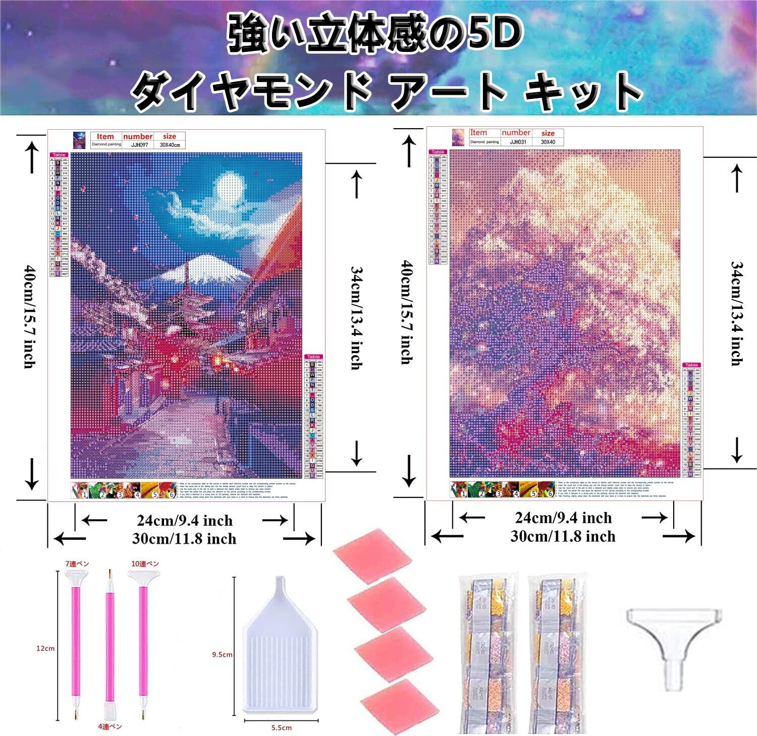 【ダイヤモンドアート キット内容】--2枚セットの5Dダイヤモンドアート、2枚のラベルステッカー、8個のグルー、6本のダイヤモンドペン、2個のビーズトレイ。(ダイヤモンドビーズの不足を避けるために、ビーズの数を30%増やしました。)本セットがあれば手軽にダイヤモンドアートを始めれます。