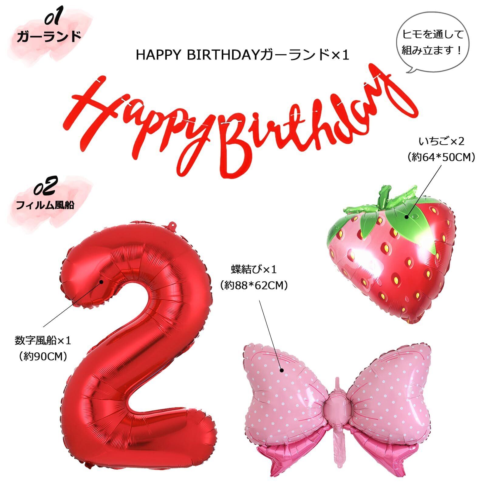 Lausatek バルーン 誕生日 2歳 風船セット HAPPY BIRTHDAY バースデー ガーランド バースデー 飾り付け 数字2 いちご 蝶結び 装飾 お祝い イベント 子ども 男の子 女の子 赤 レッド