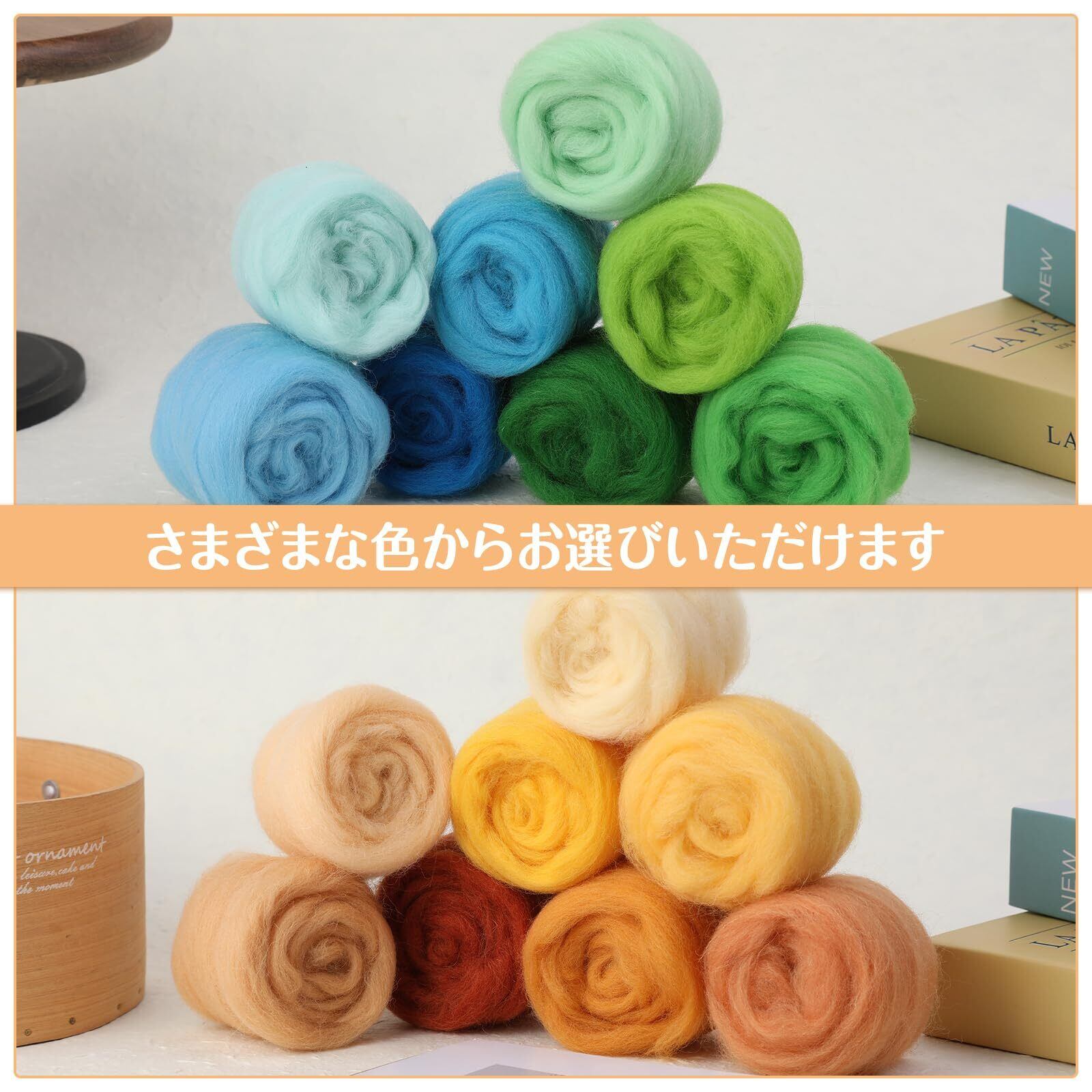 内容物: さまざまな色のウールロービングが付属しており、各色は透明で再密封可能な袋に個別にパッケージされており、各色あたりの重量は約 10 グラムです