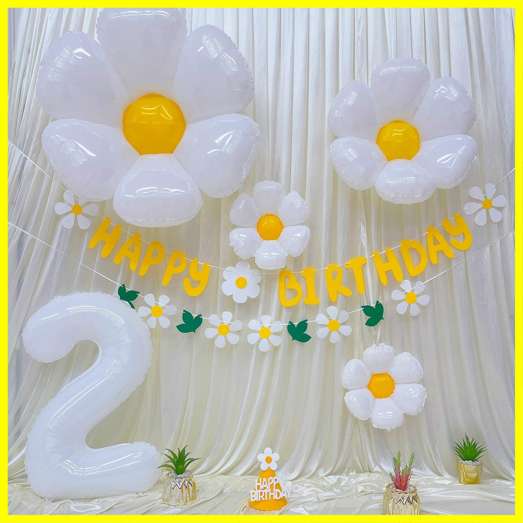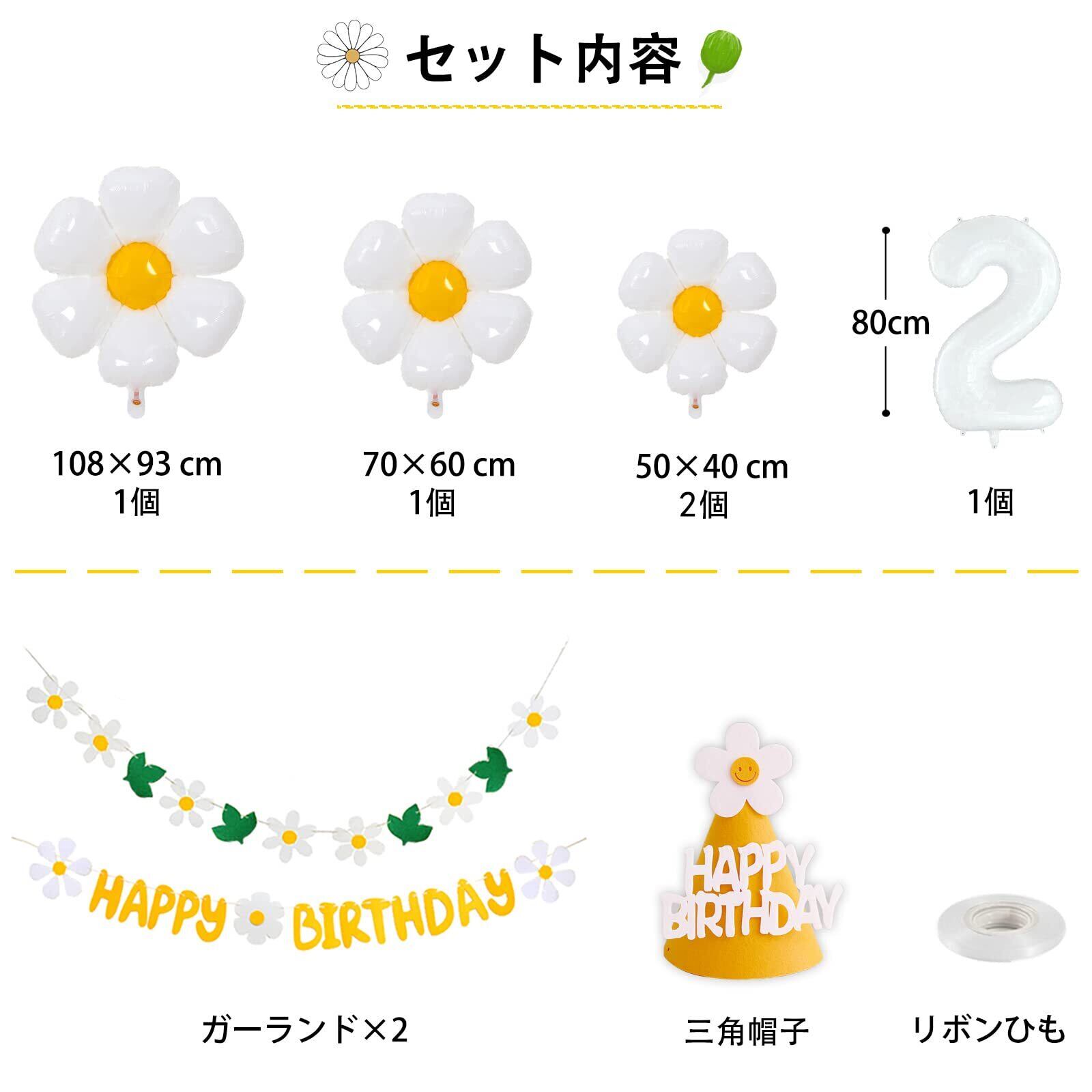 【セット内容】①フェルト布ガーランド×2 ②デイジーバルーン ×4 ③数字バルーン×1 ④三角帽子×1 ⑤リボンひも (10m)