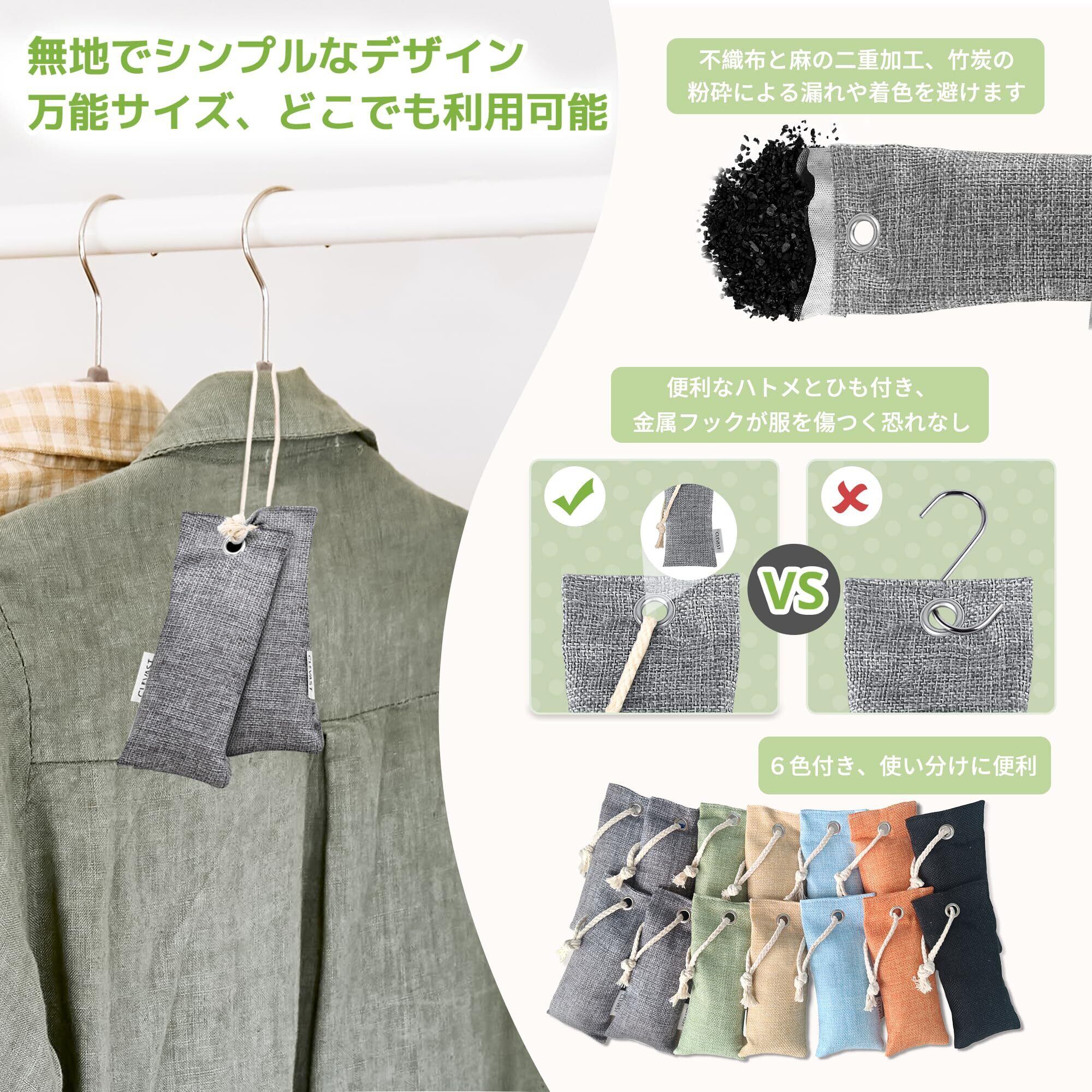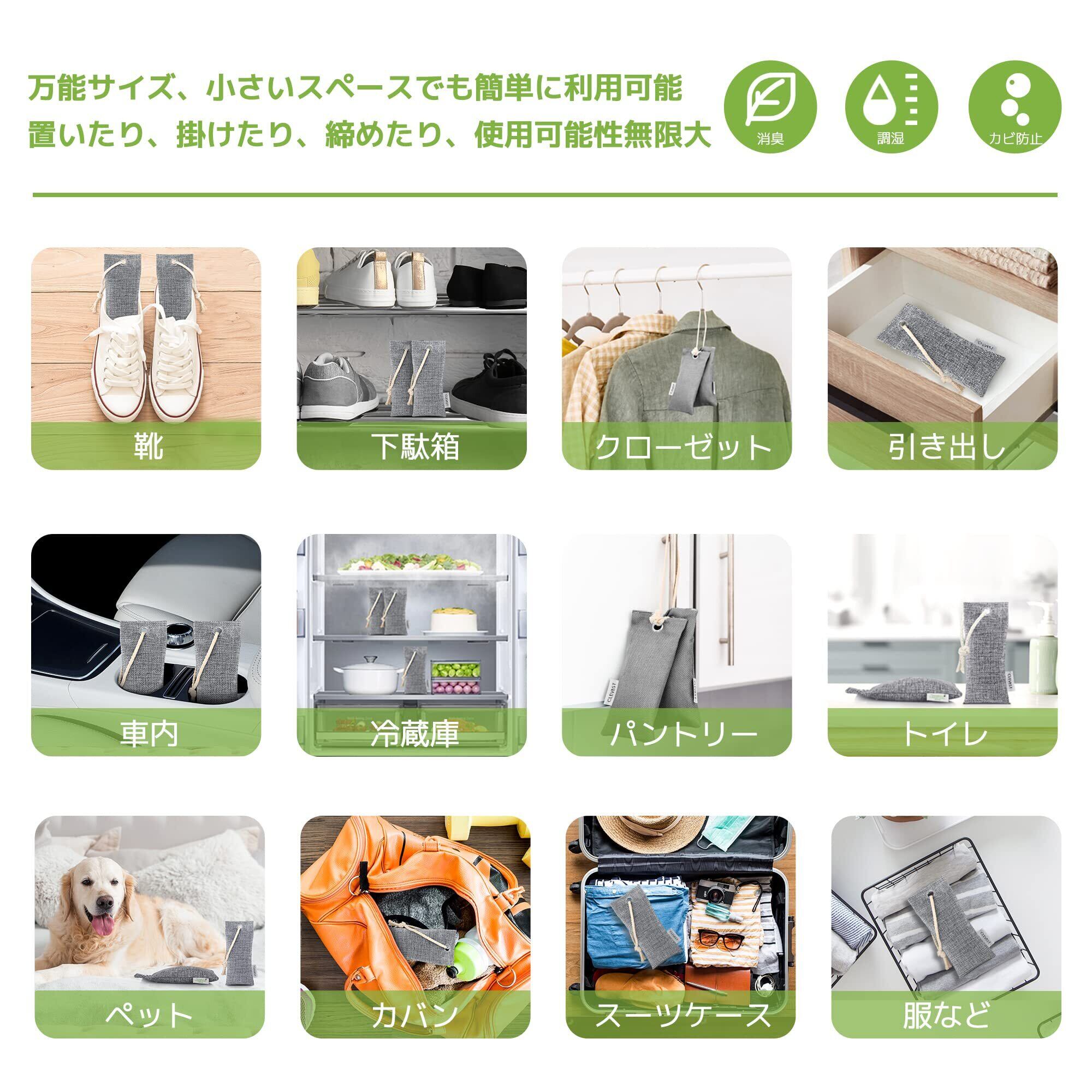 【漏れや着色防止】不織布と麻生地の二重加工袋で包装され、竹炭の劣化粉砕による漏れや着色を避けます。無地かつシンプルなデザインで、使用場所の清潔さをキープしてくれます。また、天日干しをすれば吸収力が回復し、最大二年間繰り返してご使用いただけます。更に、使い終わったら土に撒き、植物の成長を促進して土壌改善効果も期待できます。