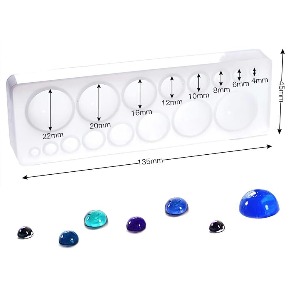 特徴:レジンで使用できる、シリコンモールドで、8種類の半球を作る事ができます。半球を合わせて、球体を作ったり、アクセサリーを作る事ができます。