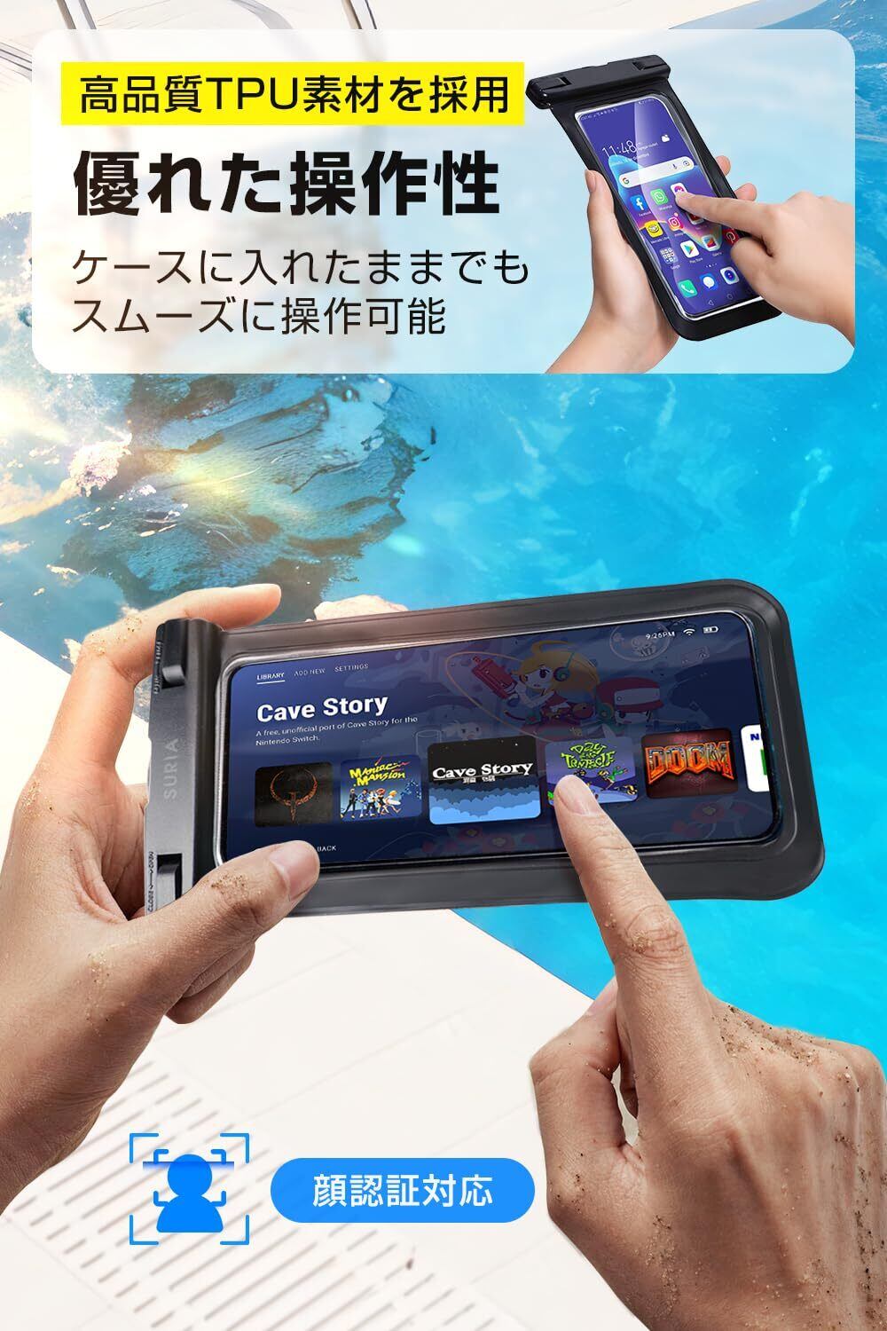 【操作性を損なわず・水中撮影・顔認証・タッチ快適】スマホを防水ケースに入れてもタッチ操作、通話、メッセージ応答、写真撮影、Face ID顔認証などの操作もできます。音声もクリアですので、ケースを装着したまま通話や音楽鑑賞など通常と同じようなスマホ操作ができます。温泉で音楽や動画を楽しみたい時、潜水中でメール受信を確認したい時など様々な場合に役立ちます。