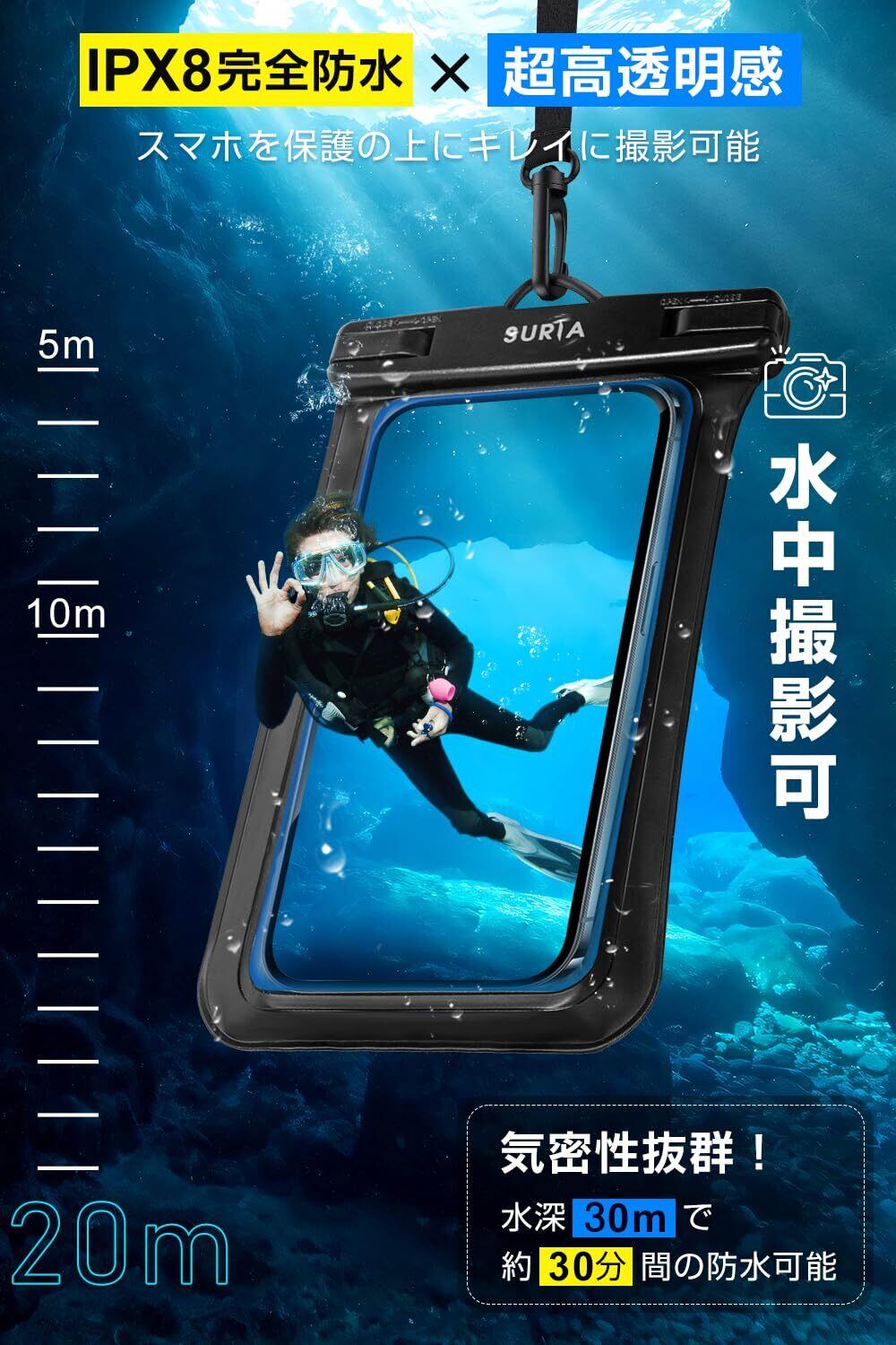 【ストラップ&アームバンド式両用】便利なストラップもついているので、海やプールなどの持ち運びにもとても便利なケースになります。また、アームバンドも付いており、しっかりアームに固定すれば、ビーチバレなどのアクティブなマリンスポーツやウインタースポーツ、ジョギングなどでも、ズレ落ちず使えます。※ご注意:ご使用の前に必ず携帯の代わりに一枚の紙をケースに入れて、30分間の防水試験を行ってください。