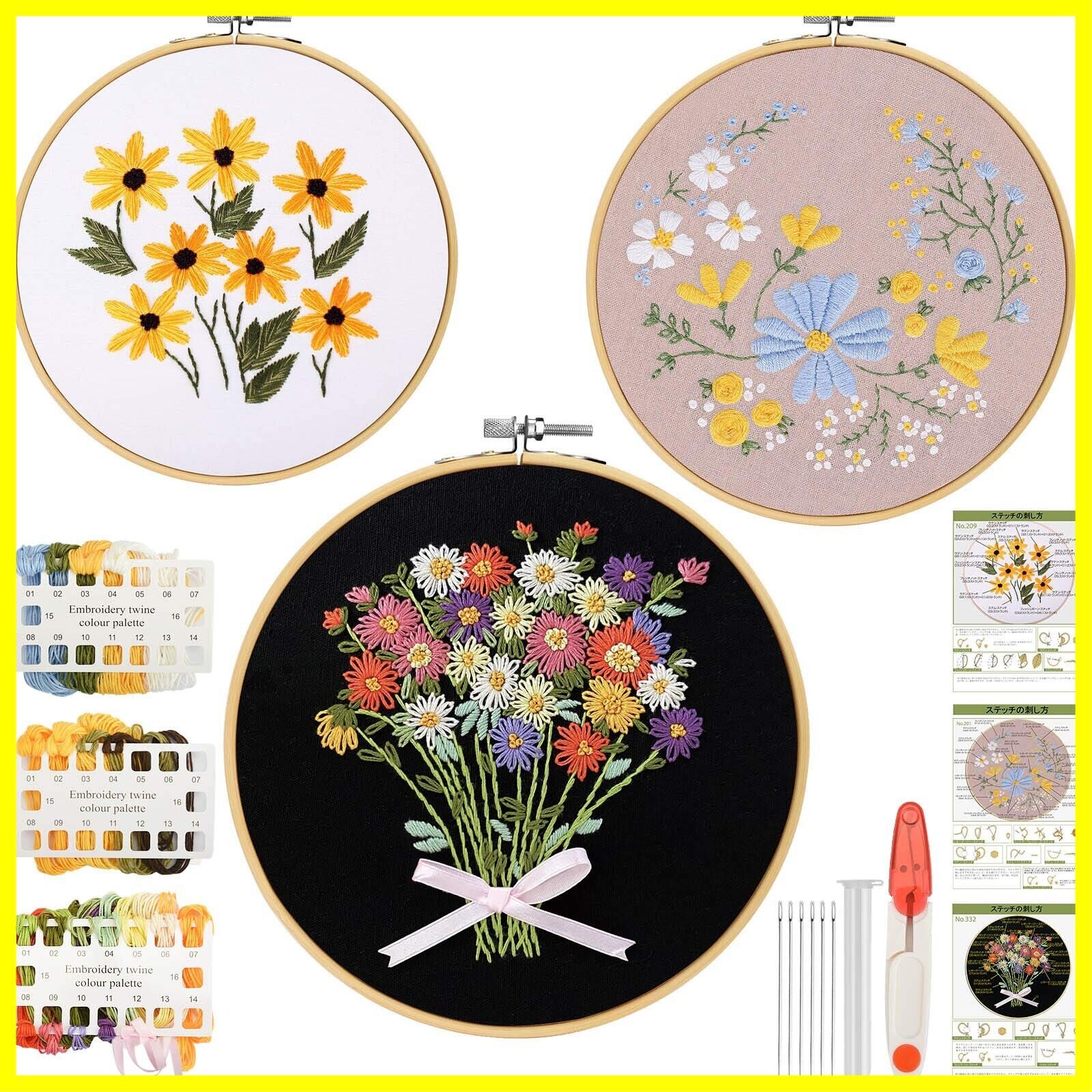 mefeny 刺繍キット 刺しゅう 初心者 パターンあり 英語と日本語ステッチ方説明書付き 3セット 竹製刺繍枠3本15CM/18CM/20CM 刺繍糸 刺繍針6本 刺繍布3枚 ハサミ1本 初心者学ぶ 花