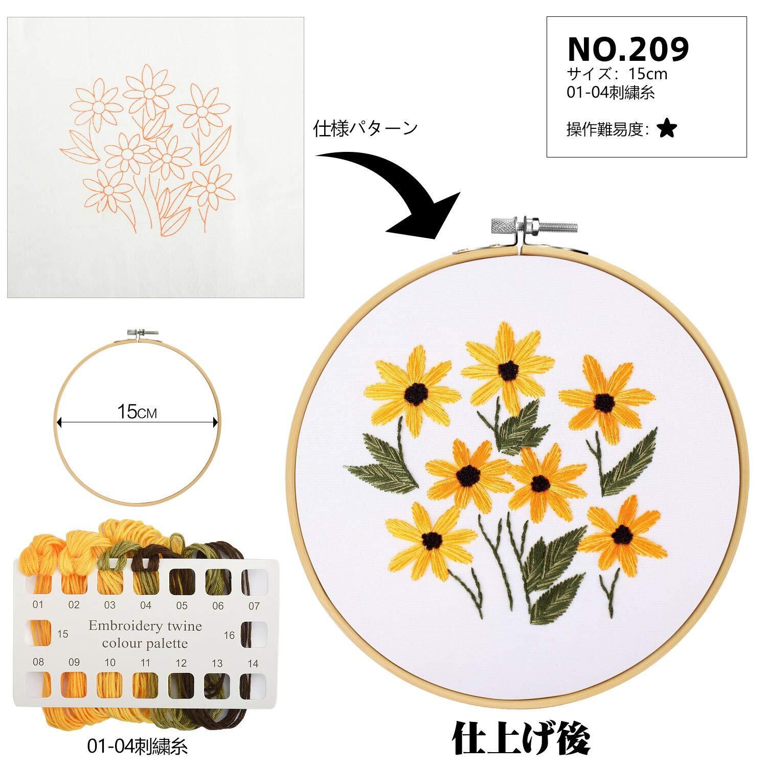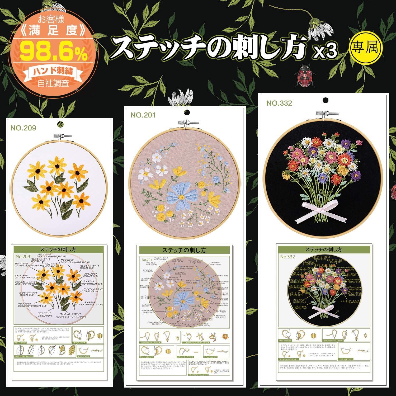 ❀[豊かな刺繍セット]:刺繍枠*3本(15CM/18CM/20CM)、刺繍布*3枚、刺繍糸*3パック、刺繍針*6本、ハサミ*1、英語ステッチ方説明書*1枚、日本語ステッチ方説明書*1枚。糸の太さと布の厚さに相応しい針でした。ご注意:この製品は素材だけで、未完成品です