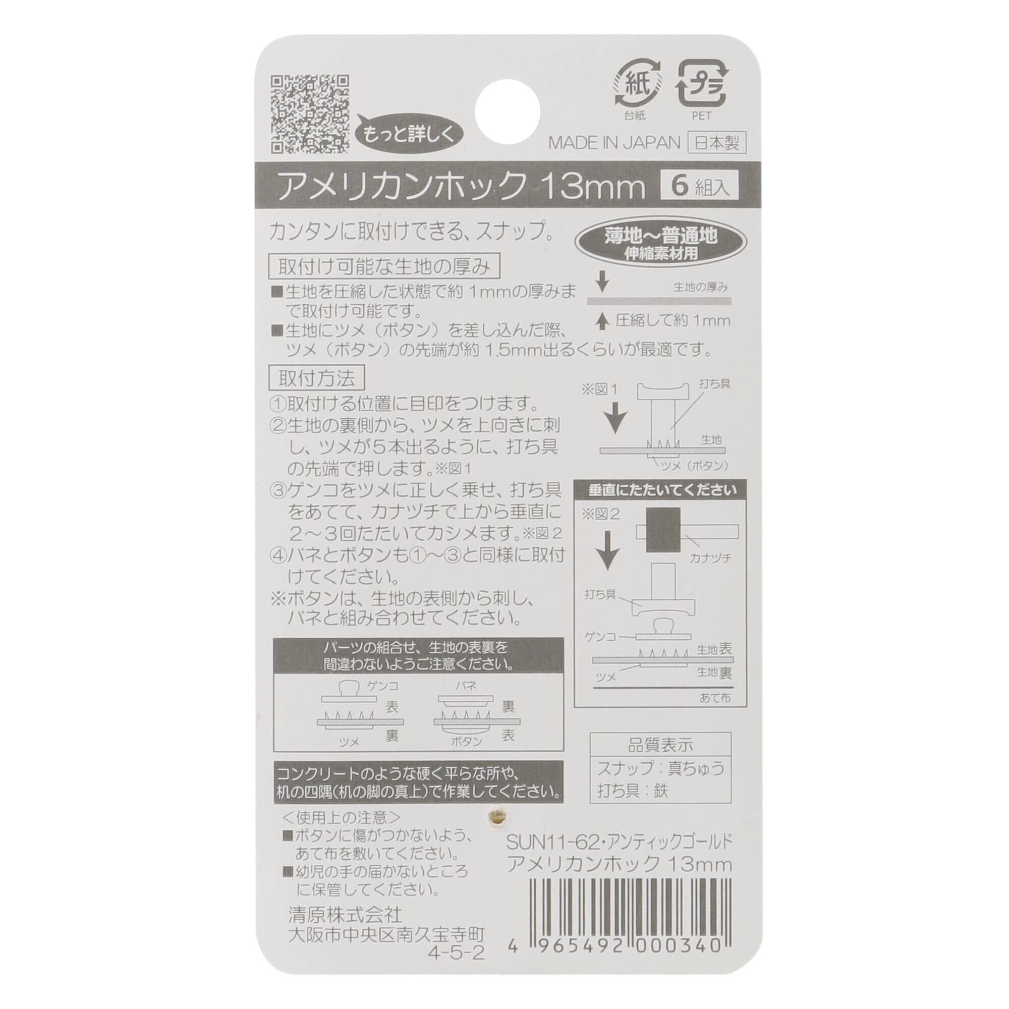 KIYOHARA サンコッコー アメリカンホック 6組入り 直径13mm アンティックゴールド 打ち具付き SUN11-62