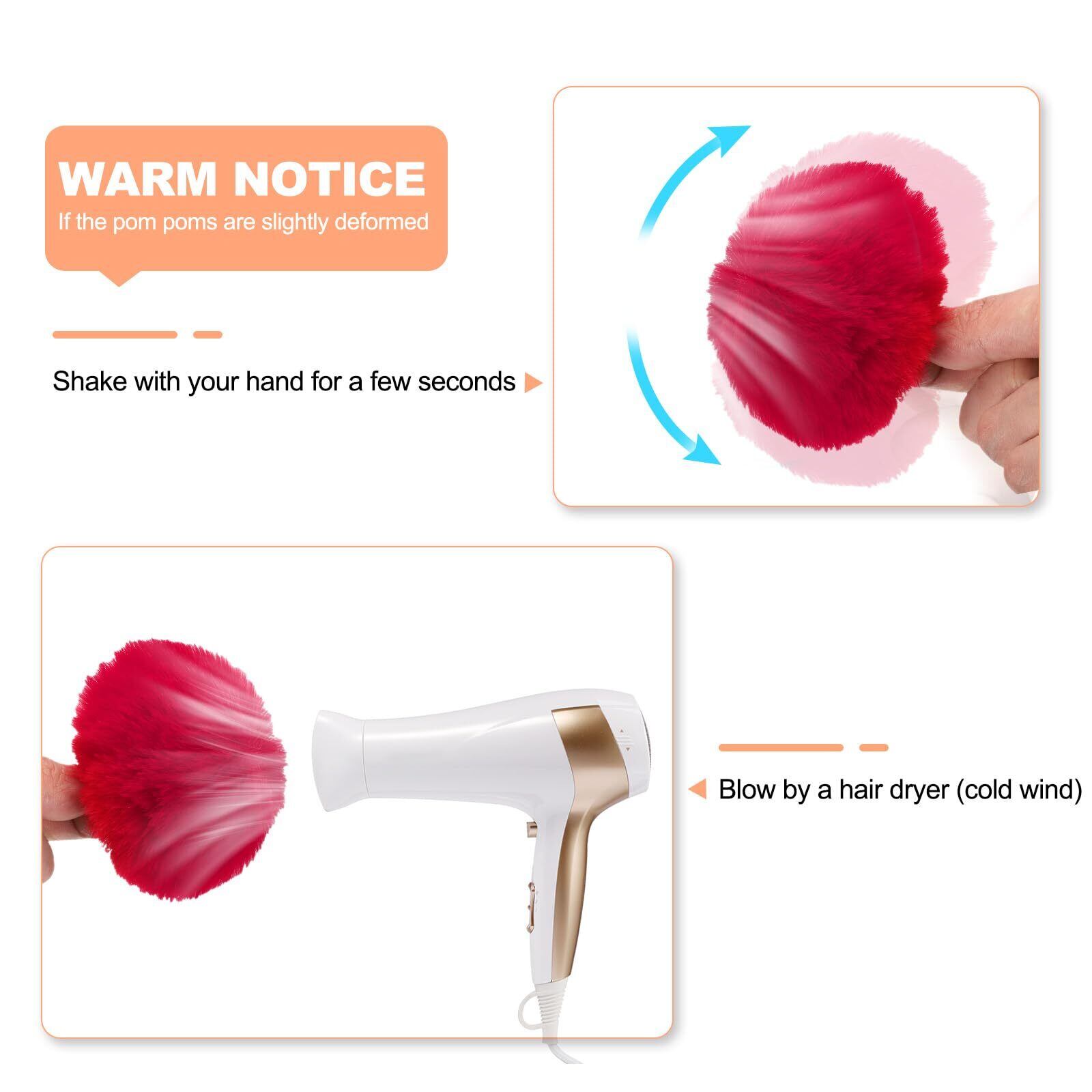 ご注意: 物流と輸送のため、フェイクファーポンポンはわずかに変形する場合があります。元の形に戻すにはヘアドライヤー(冷風)を使って吹き戻すか、数秒間手で振ってください