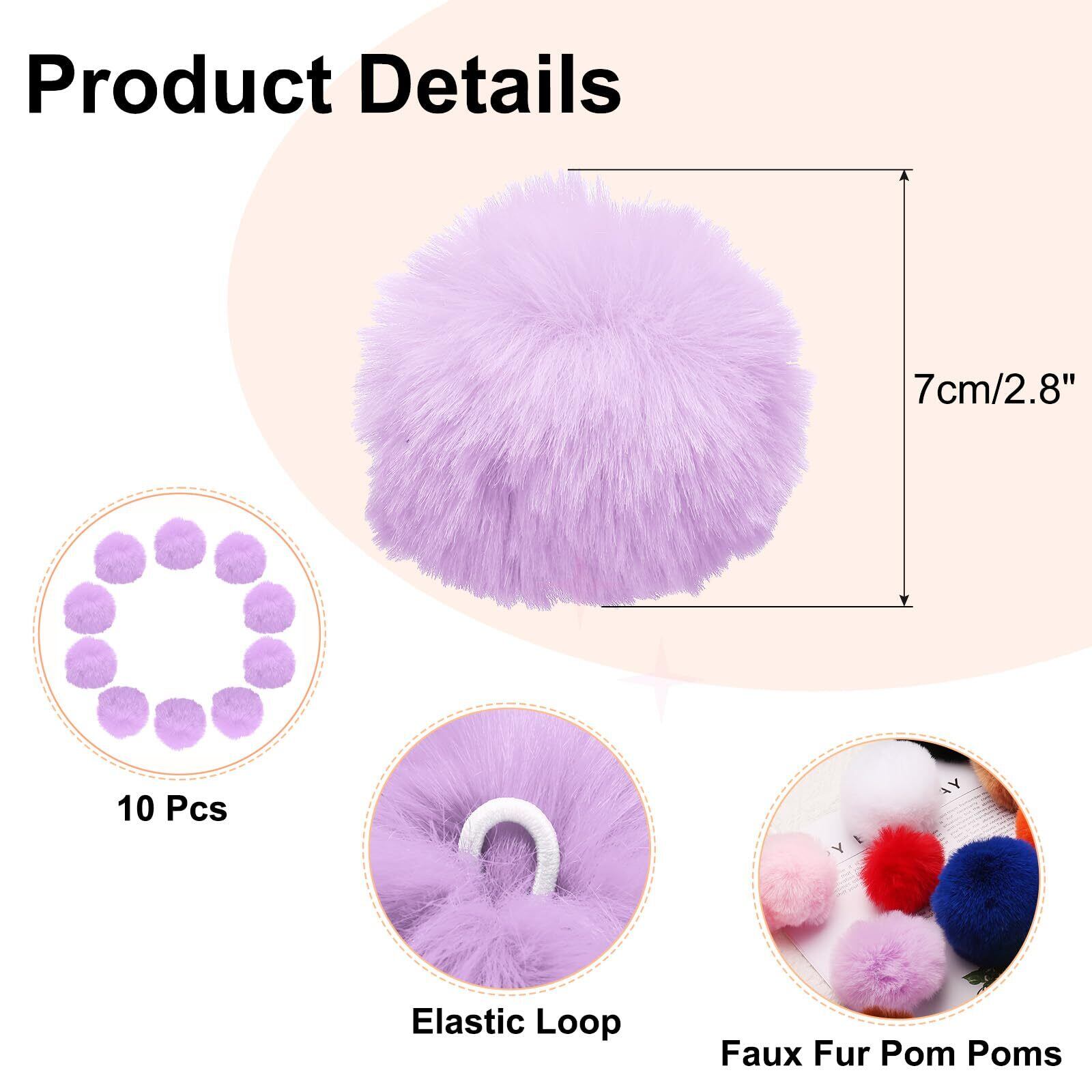 フェイクファーポンポン: パッケージにはライトパープルのポンポンが10個入っており、直径約7cm/2.8"で、各ポンボールには簡単に取り付けられるゴムループが付いています