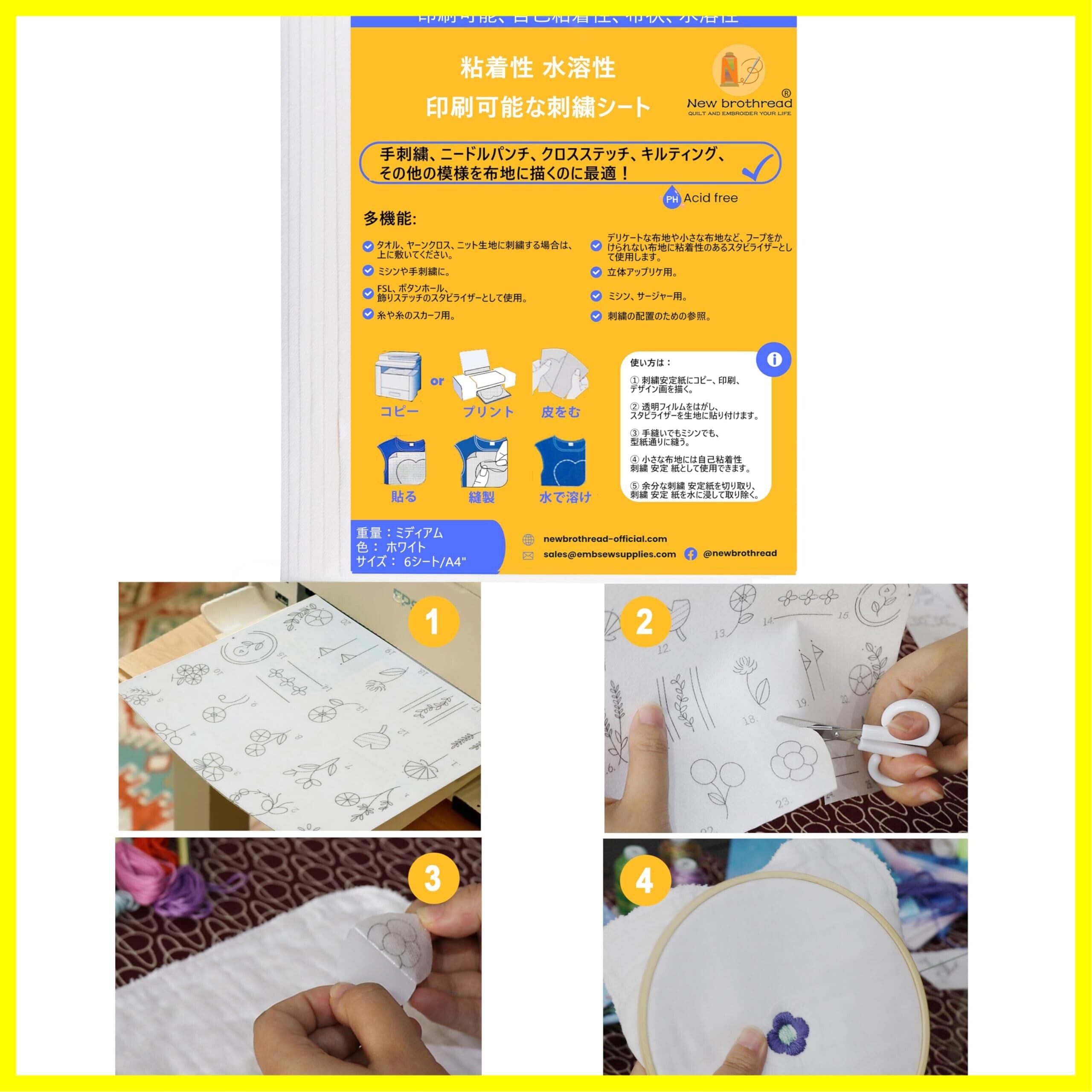 New brothread 6枚 A4 (29.7x21cm)粘着刺しゅう用水溶性シート 刺繍に 水でとける 下絵シート 印刷可能な刺繍紙 刺しゅう安定紙 手刺繍とミシン刺繍に適したパターンを印刷し、描くことができます