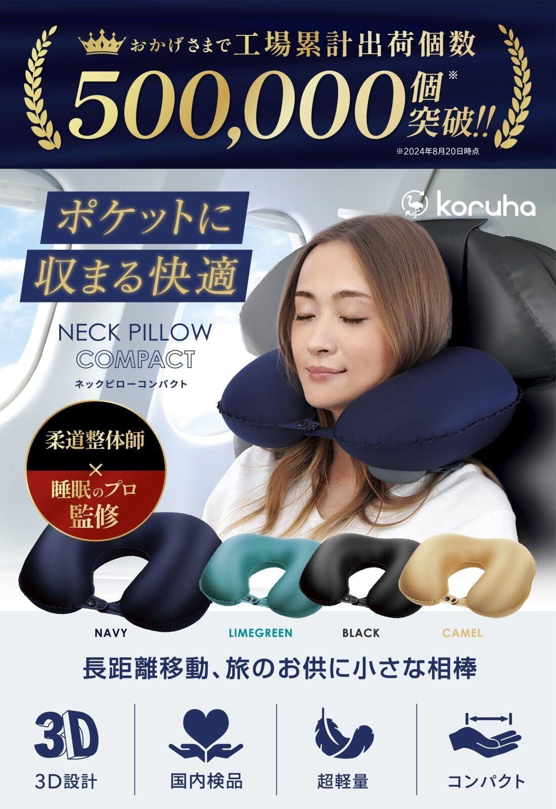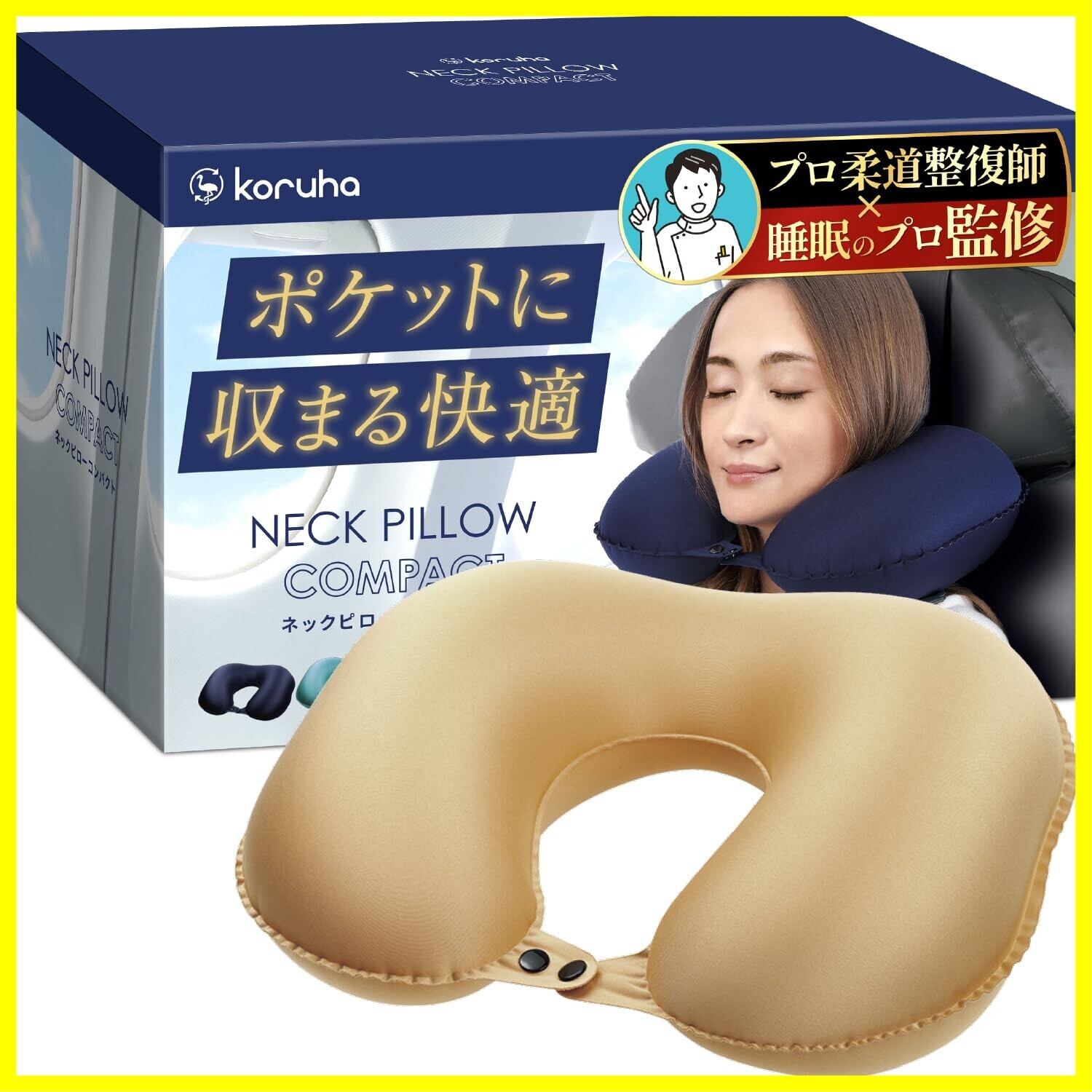 ネックピロー コンパクト【整体師×睡眠改善インストラクター監修】ポンプ式 軽量 エアー 飛行機 車 新幹線 首枕【MONOQLO ベストバイ受賞店】 neck pillow トラベルピロー 長距離 旅行 低反発 携帯枕 クッション 便利グッズ 快適グッズ (キャメル)