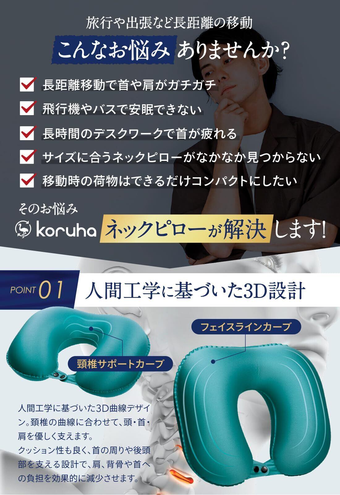【人間工学に基づいた3D設計】人間工学に基づいた3D曲線デザイン。頚椎の曲線に合わせて、頭, 首, 肩,を優しく支えます。首の周りや後頭部を支える設計で、肩、背骨や首への負担を効果的に減少させます。