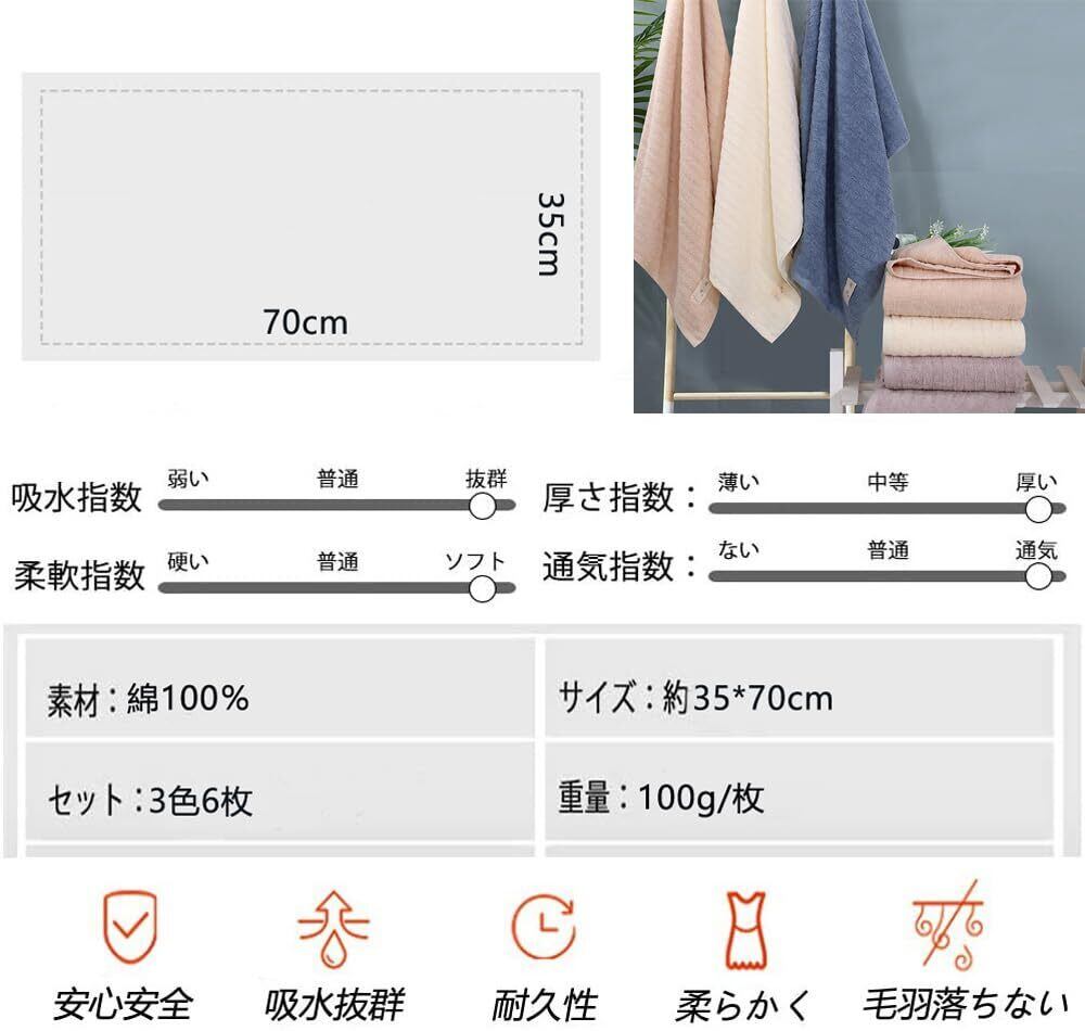 【フェイスタオル 6枚セット】素材:綿100%、サイズ:約35×70cm、重さ:約100g(1枚)、セット内容: ライトグレー 2枚、カーキ2枚、ブルー2枚。