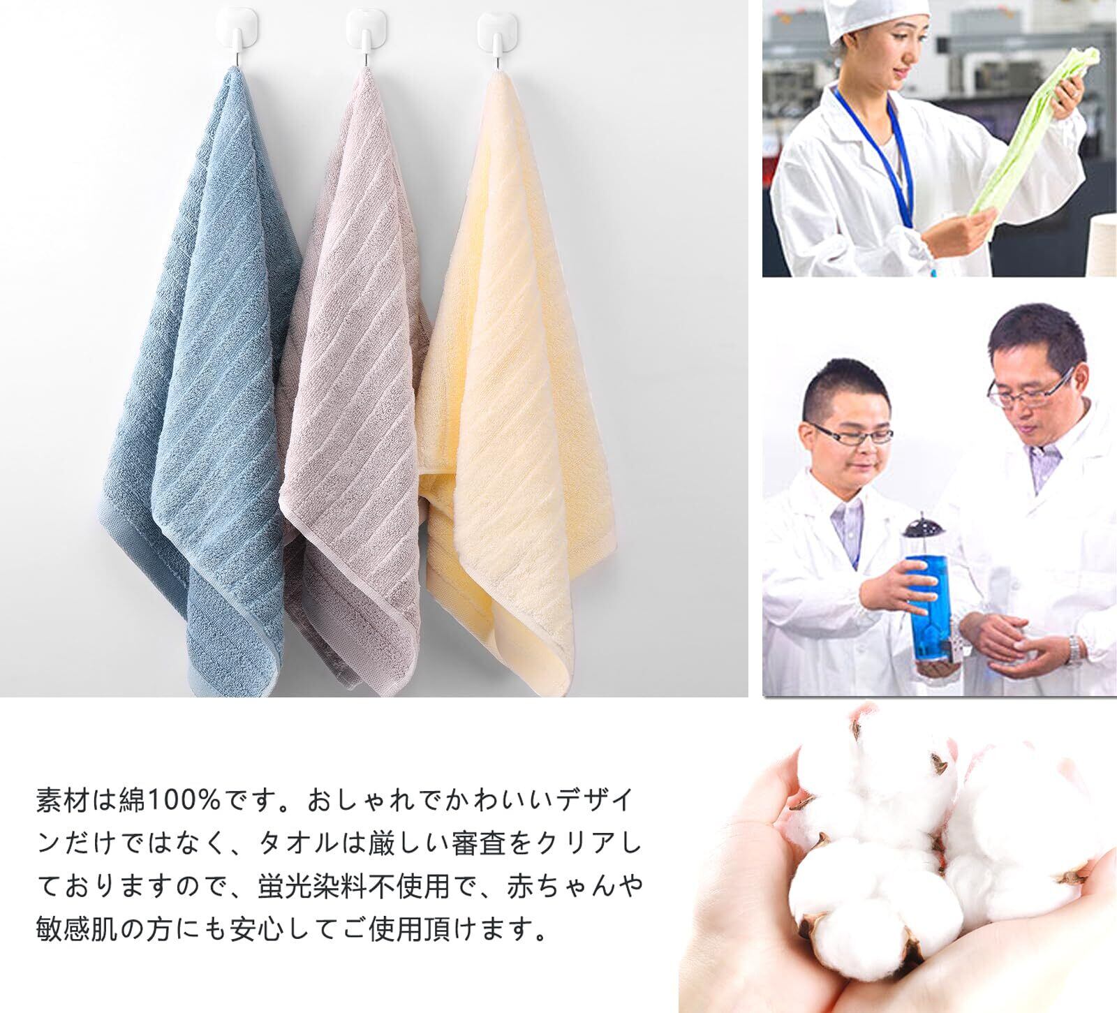 【厳選された綿100%の素材】素材は綿100%です。染色堅牢度は4級に達し、色移りや毛羽落ちがなく、何回洗濯しても変形しなくて、超長持ちタイプです。おしゃれでかわいいデザインだけではなく、タオルは厳しい審査をクリアしておりますので、においがありません、蛍光染料不使用で、赤ちゃんや敏感肌の方にも安心してご使用頂けます。