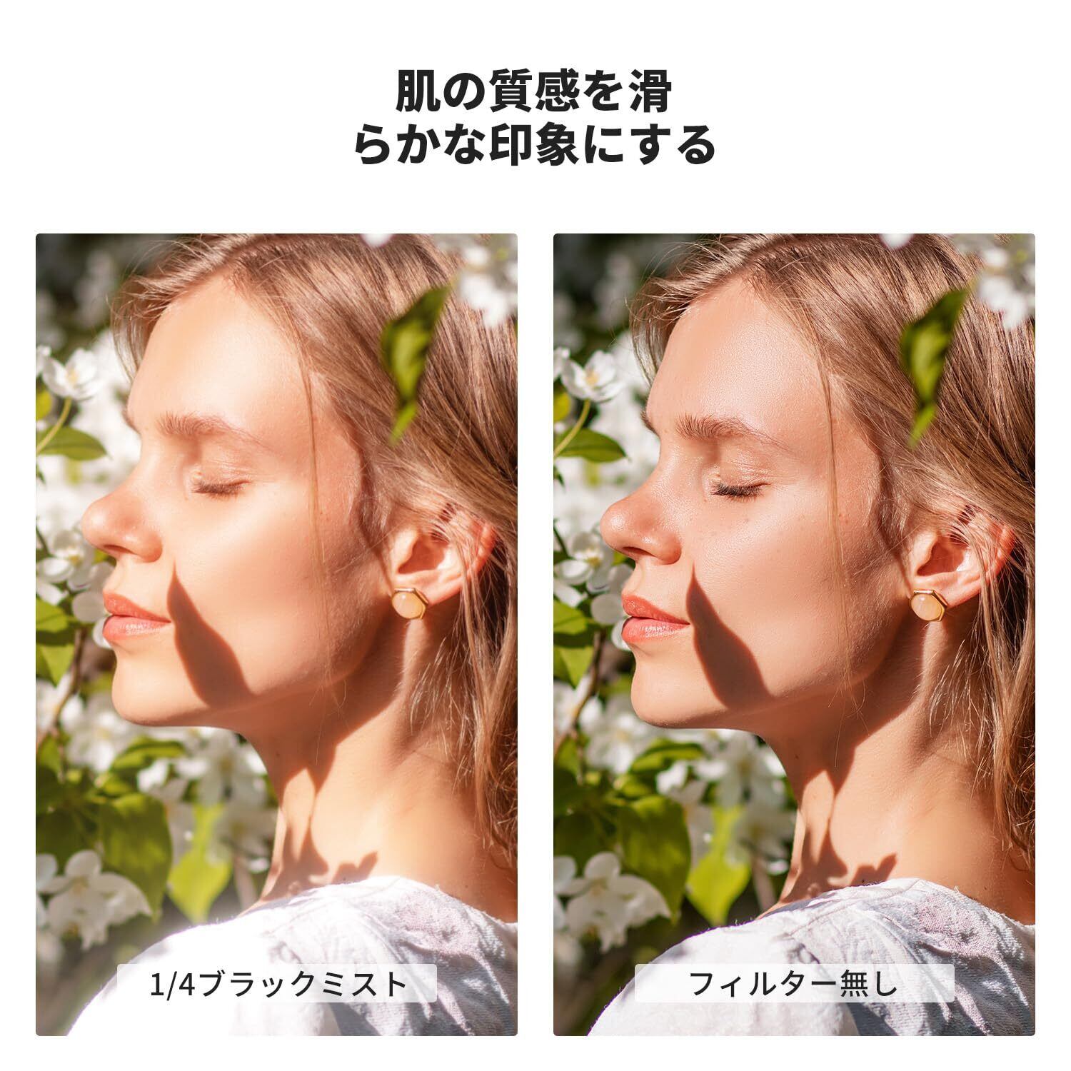 【ソフト効果&コントラスト抑え】40.5mm ブラックミスト1/4フィルターは人物向けで肌を滑らかにし、光源をやわらかくする効果があり、夜景の光や逆光、木漏れ日などの点光源もフワッと幻想的な雰囲気に仕上げてくれる。ハイライトとシャドウのコントラストを抑え、柔らかく表現してくれる写真や動画に最適。※外装の新旧が混在しますが、中身は同一です。