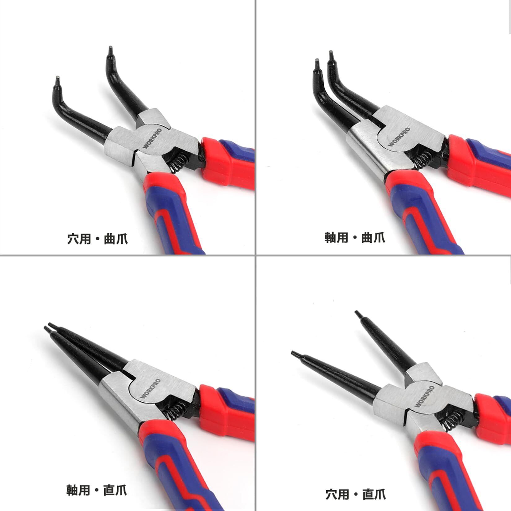 WORKPRO スナップリングプライヤー 4本組 穴用 軸用 直爪 曲爪 Cr-V材質 錆びにくい C型リングの着脱 バネ付き 工具 作業 修理 全長180mm 収納袋付き