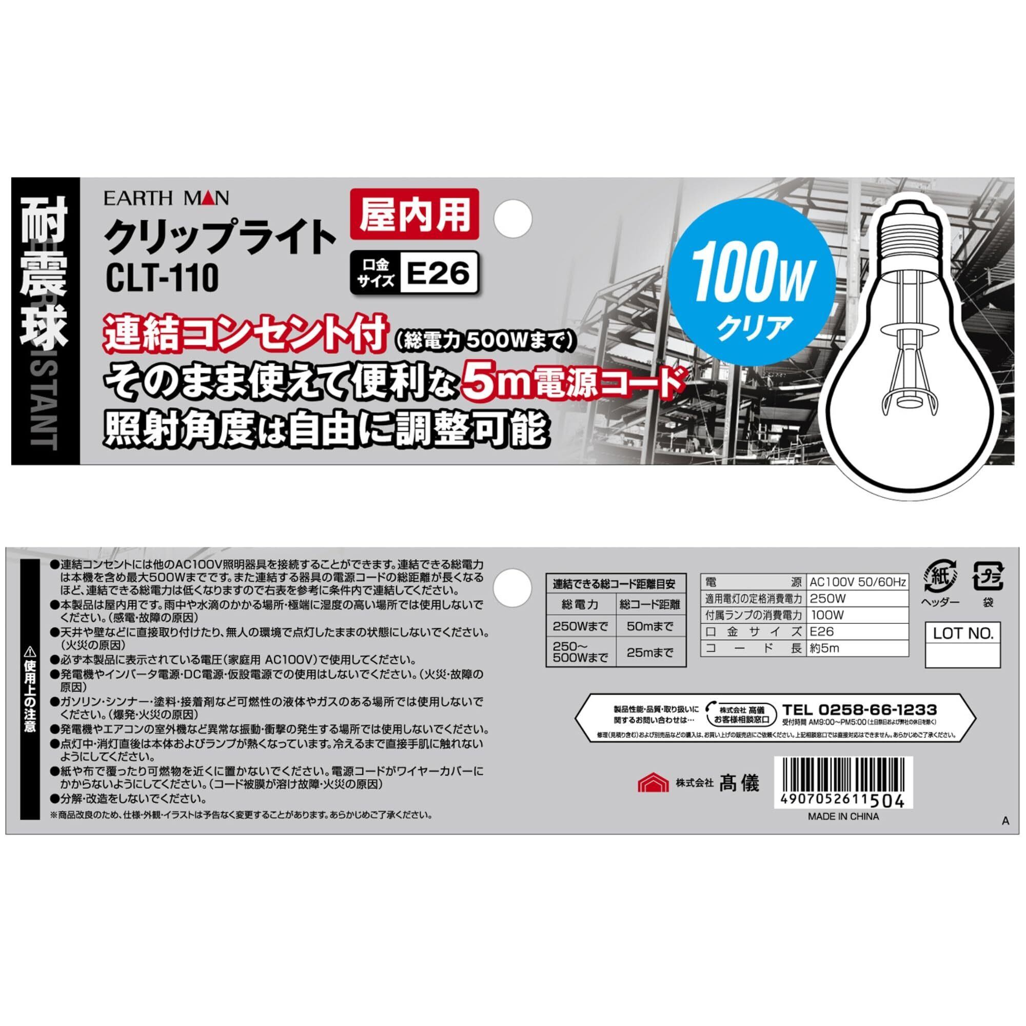 高儀(Takagi) クリップライト 100W耐震球 EARTH MAN CLT-110【連結コンセント付】【口径E26】【照射角度調整】 作業灯 工事用 現場 ライト 照明 投光器 植物育成