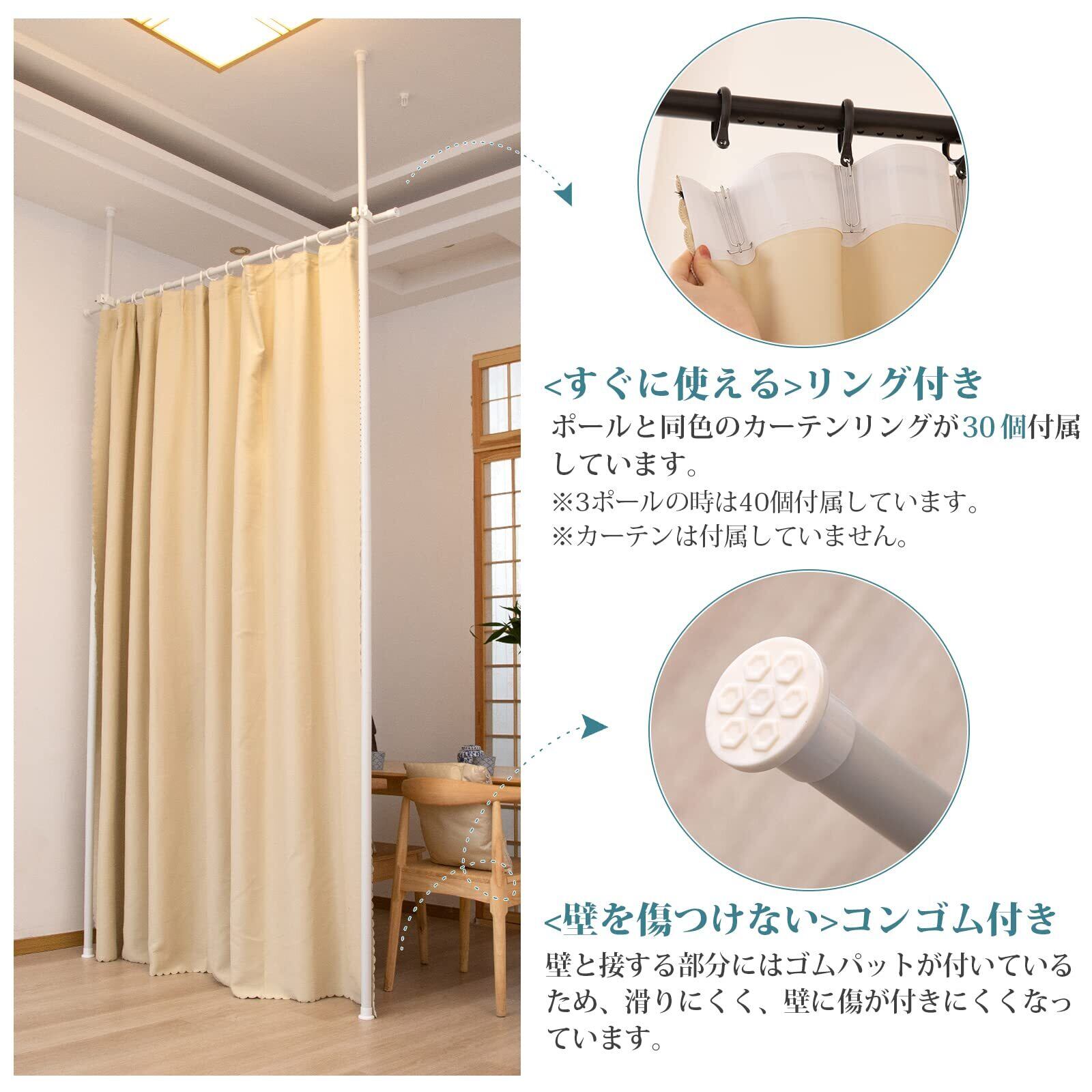 IMIEE つっぱり式 間仕切り 部屋仕切り 間仕切りカーテンポール つっぱり棒 パーテーション カーテンレール カーテンリング付 幅-高さ110cm-310cm×奥行9cm (マッドホワイト,2ポール)