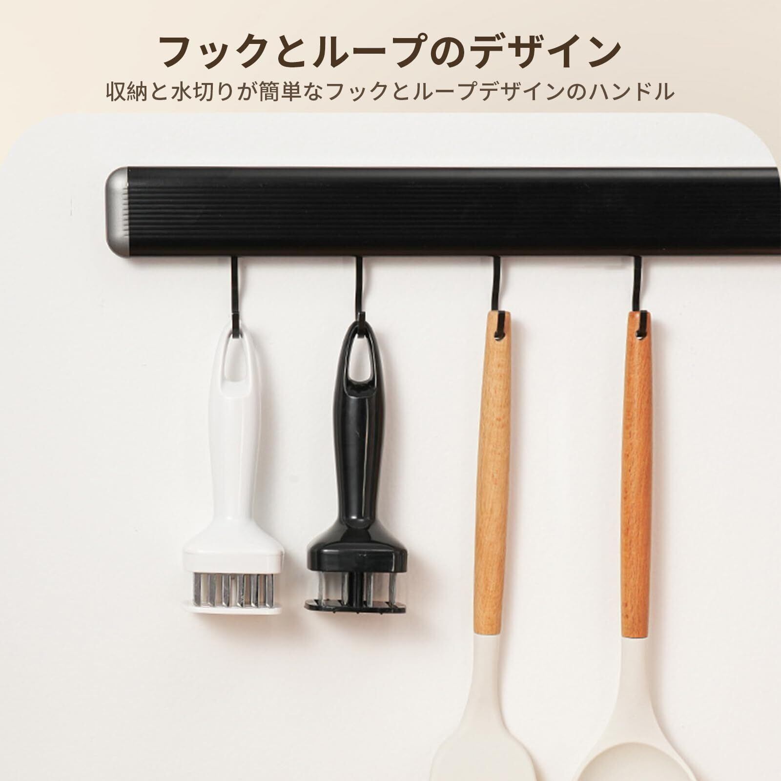 【人間工学に基づいたデザイン】ちょうど良いカーブを描く滑らかなハンドルは、片手で持ちやすいデザインです。 ハンドルの先には吊り下げ用の穴があり、キッチンフックに掛けられるので場所を取らず、収納も簡単です。