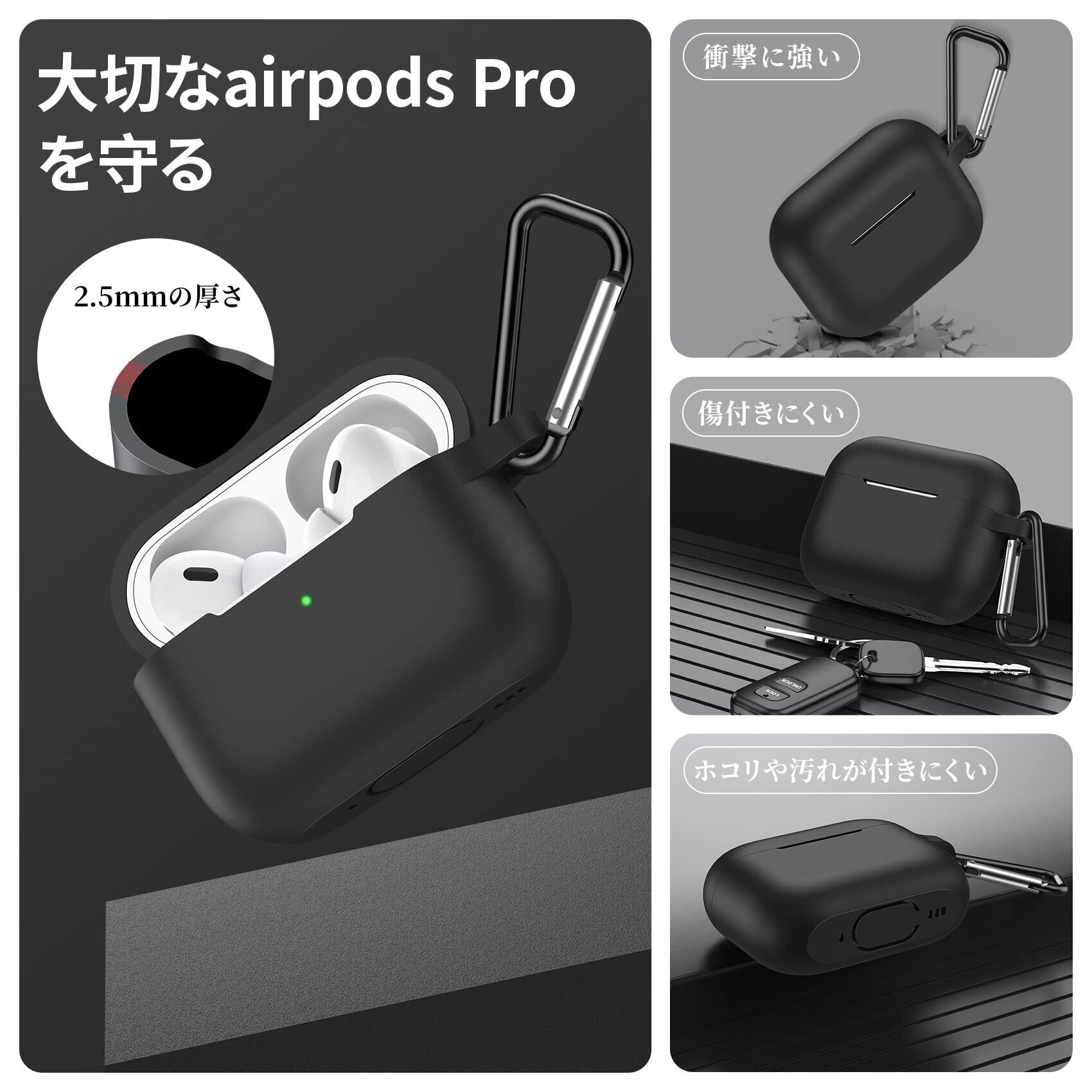 NIMASO ケース AirPods Pro 2 第2世代 専用 カバー エアーポッズ プロ 2世代 シリコン 保護 ケース カラビナ付き ワイヤレス充電対応 (ブラック) NEC22H562