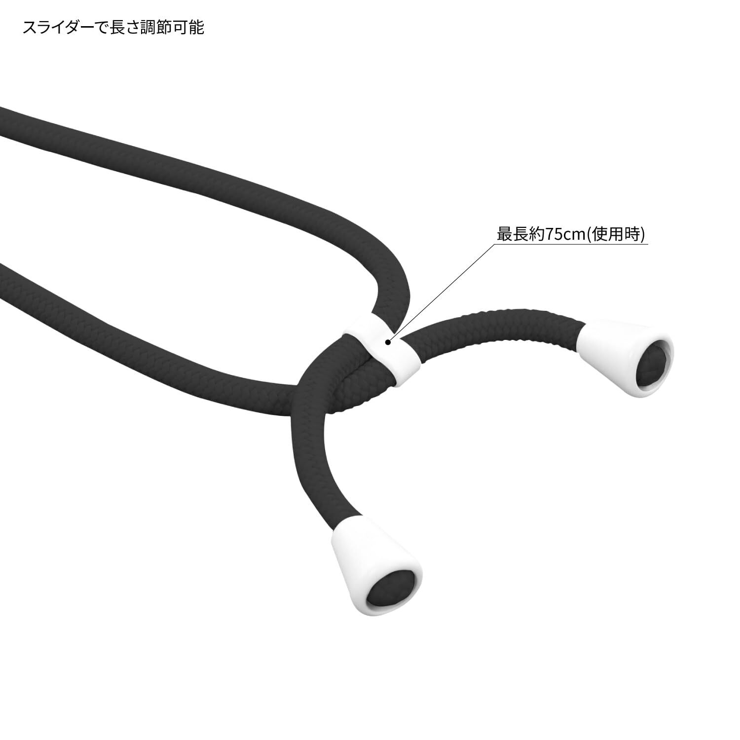 ショルダーストラップは最長約75cm(使用時)、長さが調節できるコードスライダー付き。