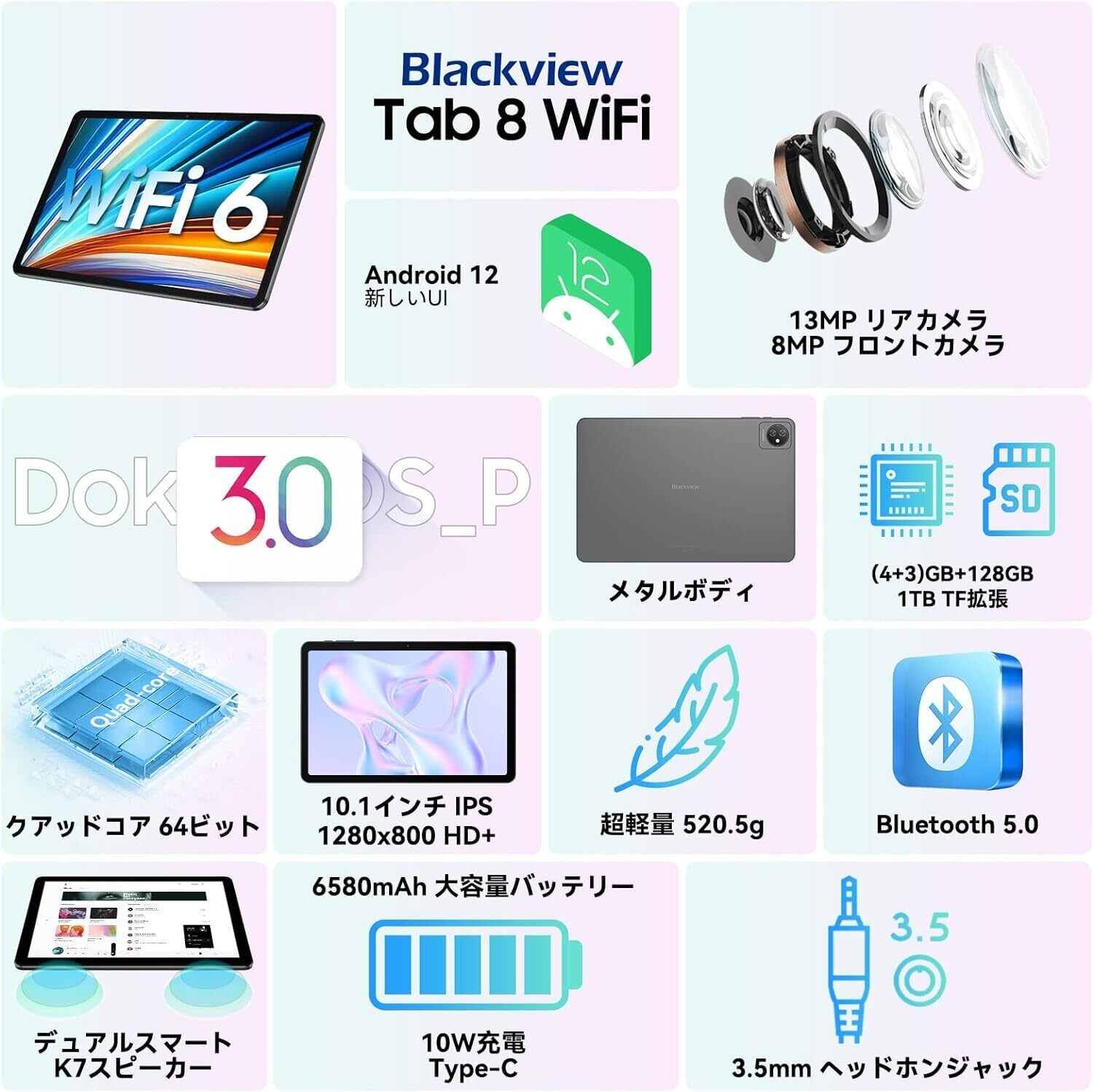 Blackview Tab8WiFi タブレット 10.1インチ Wi-Fiモデル Android搭載 7GB(RAM)+128GB(2TB拡張可能) 4コアCPU WiFi6対応 6580mAh Type-C充電 デュアルカメラ GPS機能搭載 ホームエンタメ向け