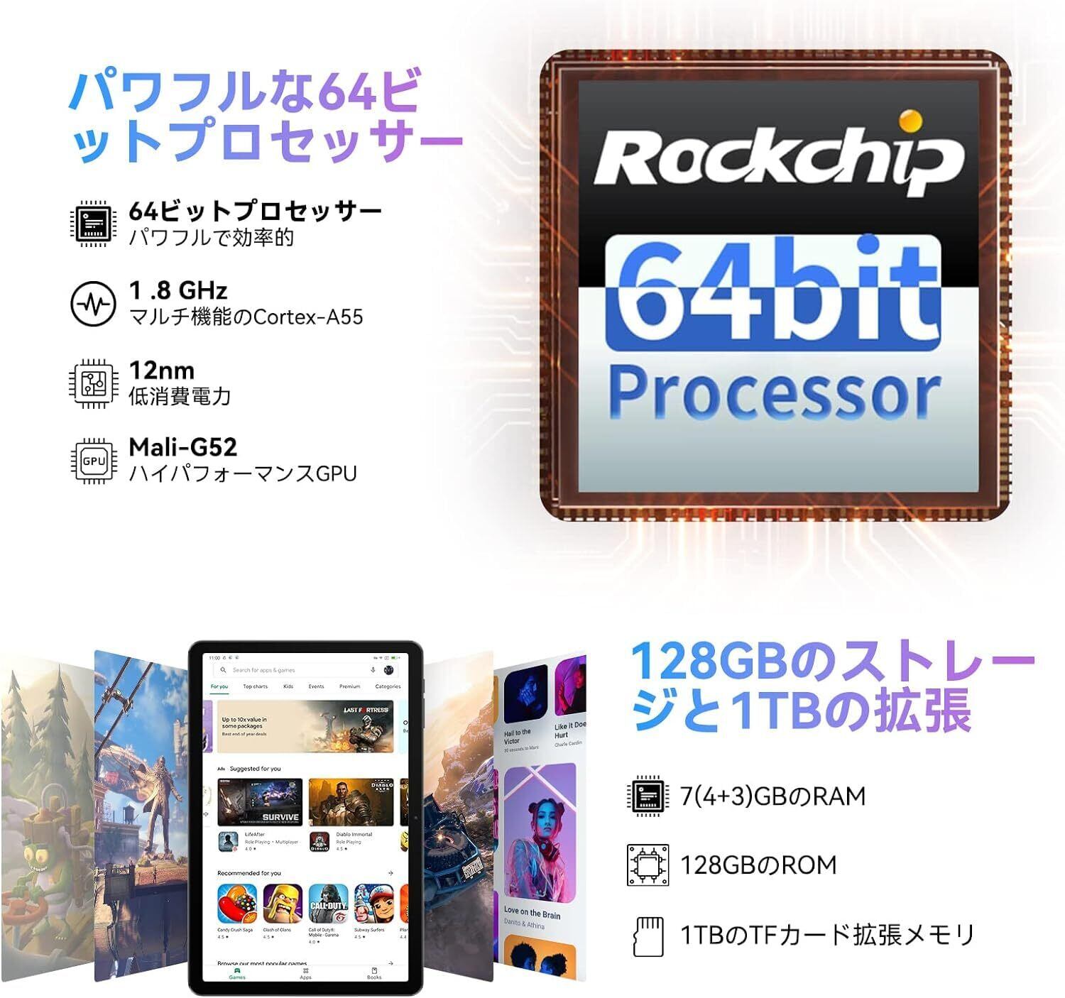 ✨【充実の基本性能】7GB(4GB+3GB仮想)メモリと128GBストレージを搭載。SDカードで最大2TBまで拡張可能です。6580mAhバッテリーで動画約7時間、音楽約20時間の連続再生が可能。Type-C端子採用で充電も便利です。