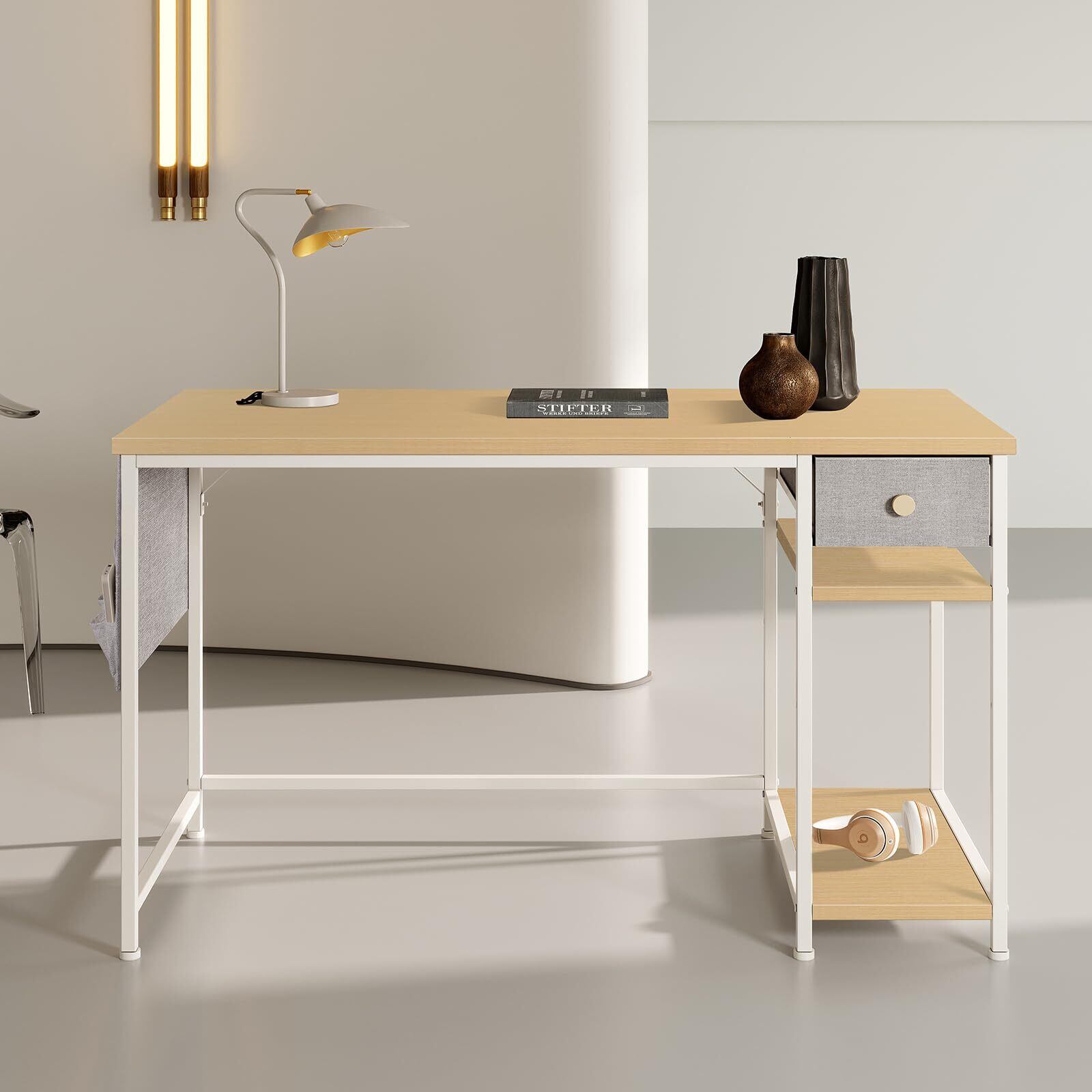 YeTom デスク つくえ ラック付きデスク 机 pcデスク パソコンデスク 幅120cm×奥行55cm 布製引き出し付き 収納ラック 収納袋付き 勉強机 学習机 左右入替可 テレワーク 在宅勤務 ライトオーク