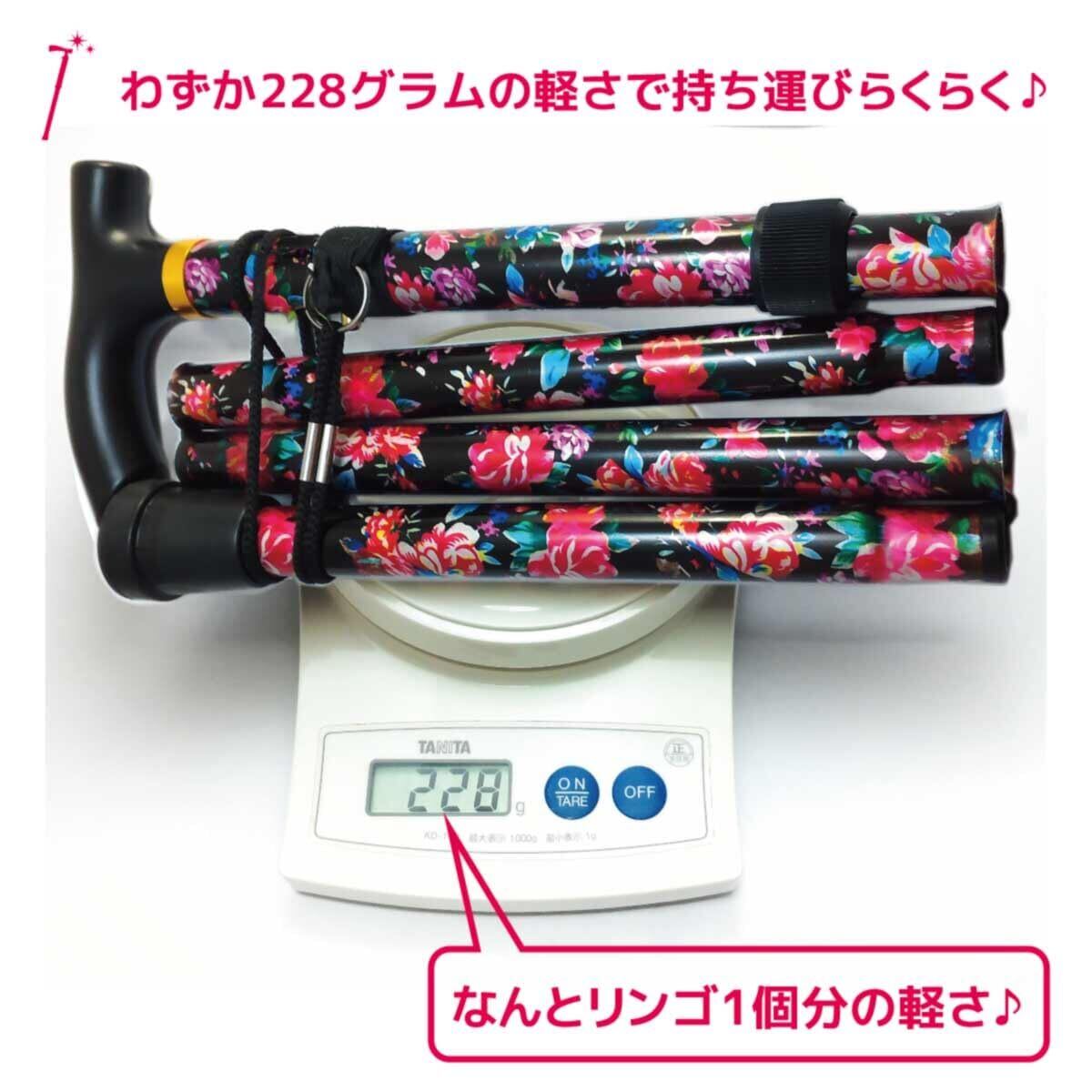 わずか228g!旅行やお出かけの携帯も楽々!花柄が可愛い軽量の折りたたみ杖です。