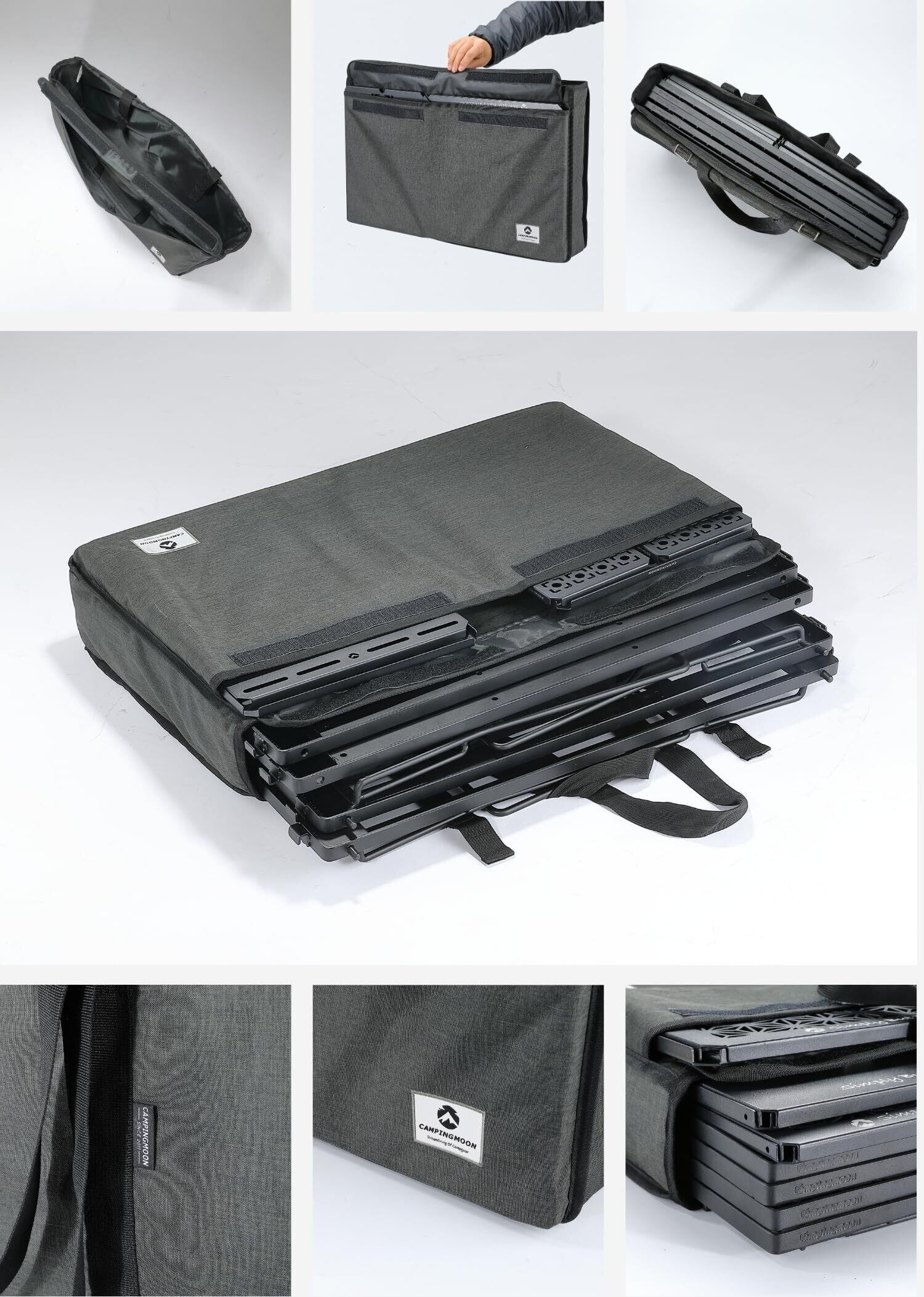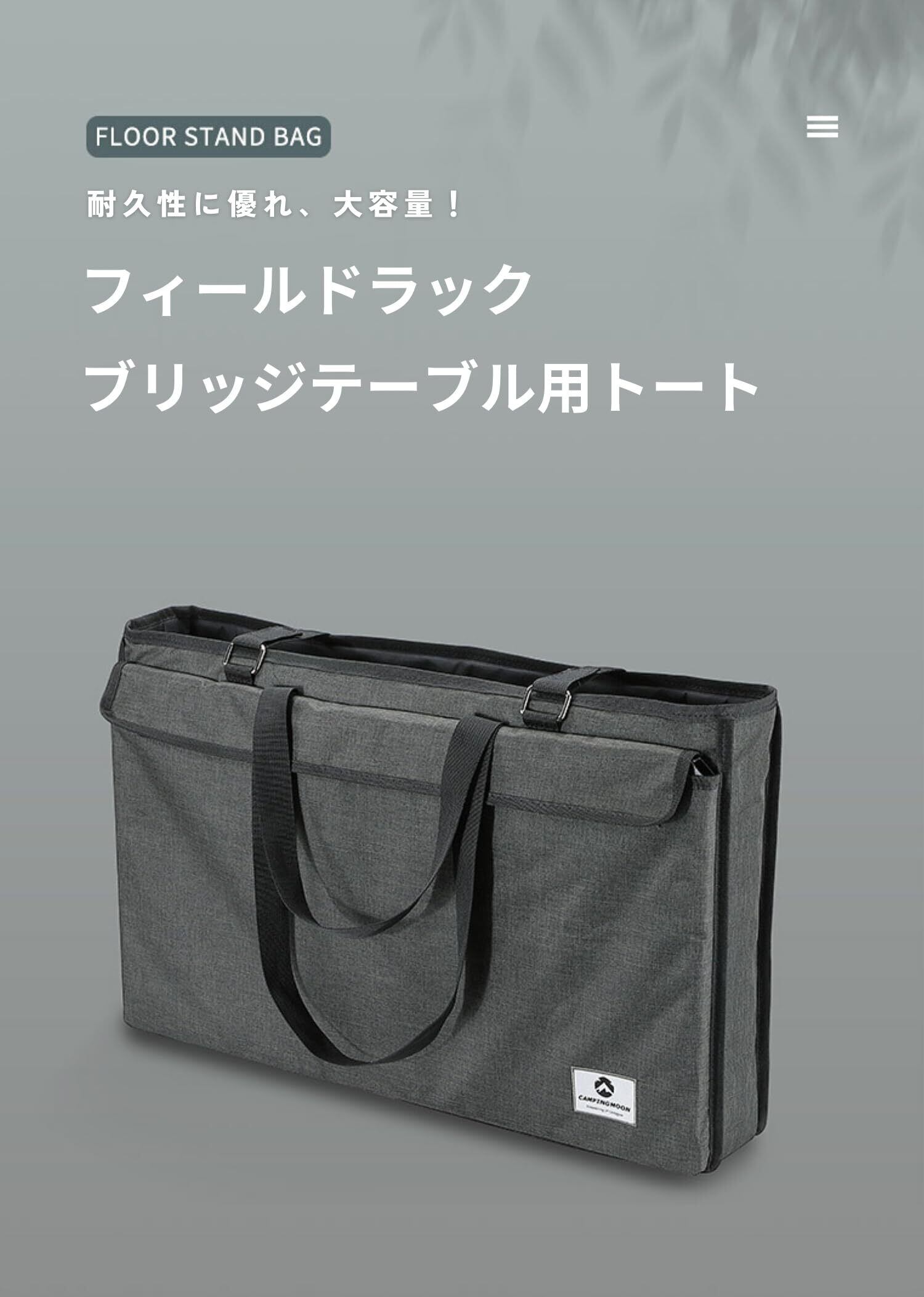 重量:約0.65kg; 収納能力:キャンピングムーン社製フィールドメッシュラック5台まで収納可能。IGTブリッジフレーム、ブリッジテーブル4台を天板とまとめて収納できます。