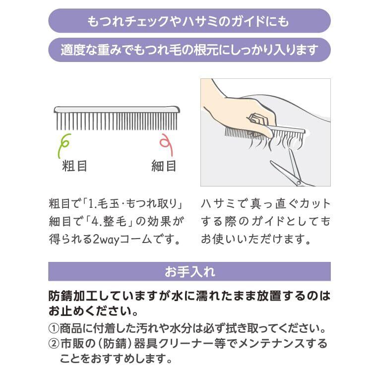 人気のおウチ・クチュール猫ちゃん専用コーム。粗目はもつれ取り、細目は仕上げに使えて便利な2Wayコームです。もつれチェックやハサミのガイドに。毛の根元にしっかり入る適度な重みです。